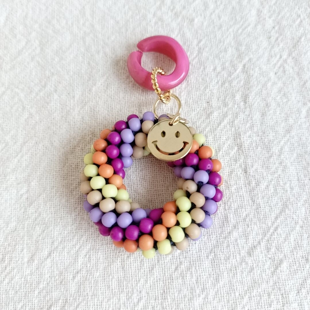 5色のビーズを丁寧に組み込んだチューブクロッシェのチャームです。