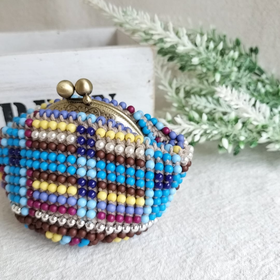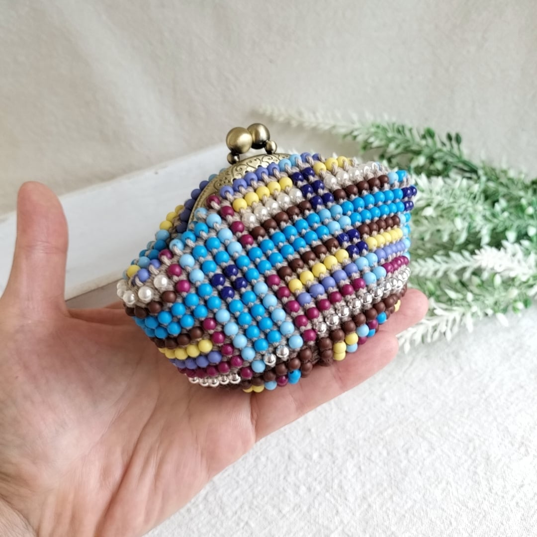 手染めビーズを編んだがま口.チェック柄.口金6.5センチ.ブルー