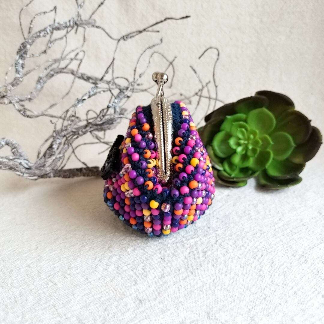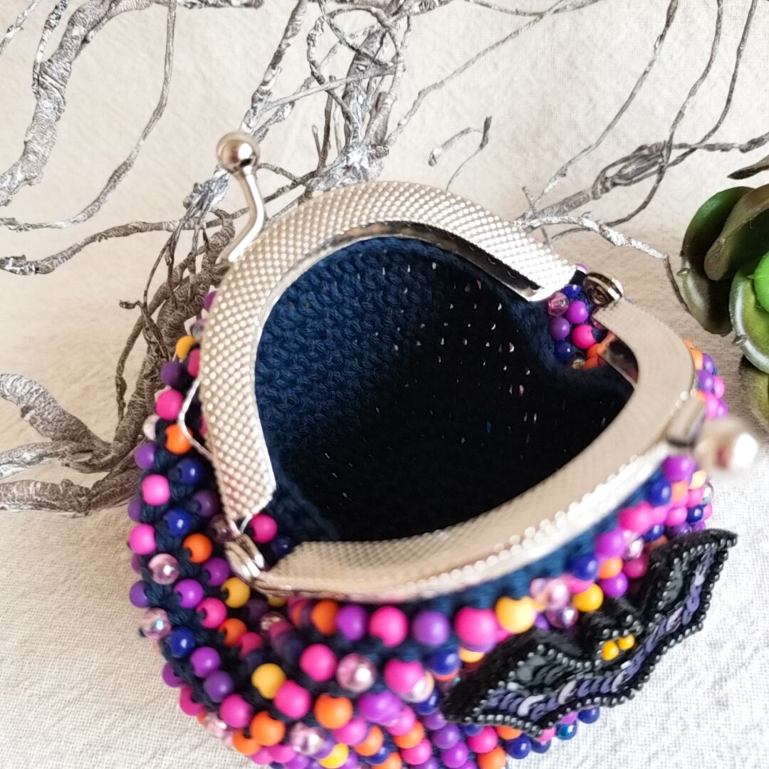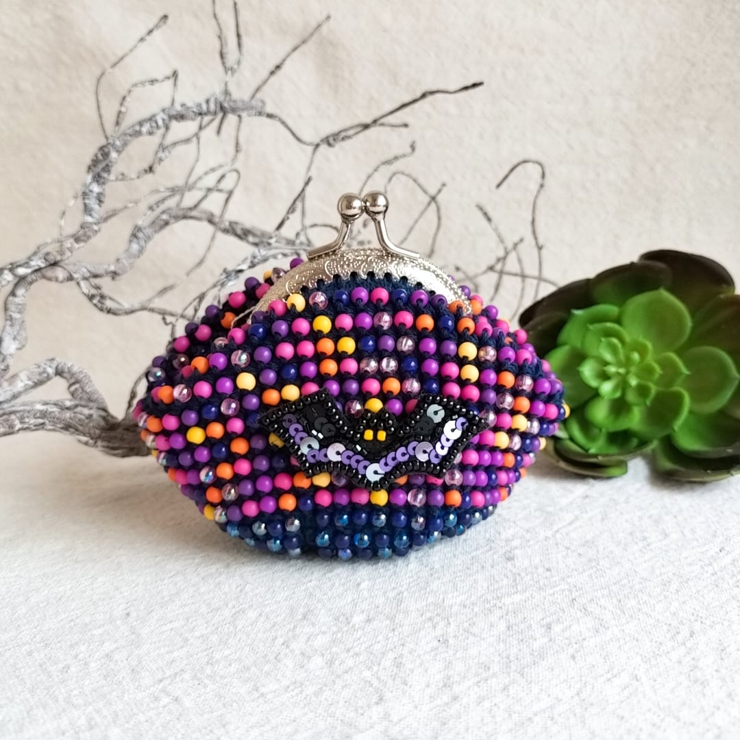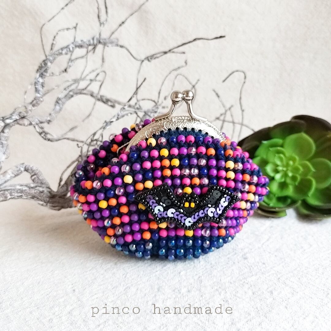 ぴんこの手染めビーズを編んだがま口.手刺繍こうもりワッペン付きハロウィン.口金6.5センチ