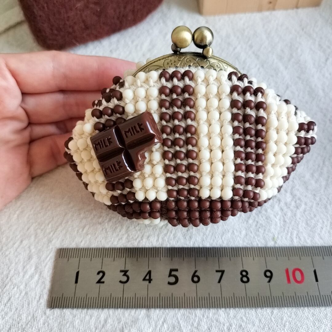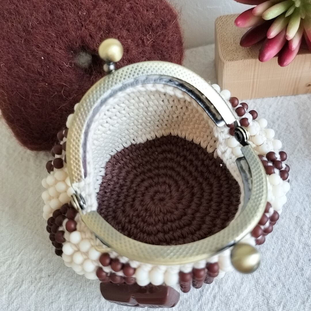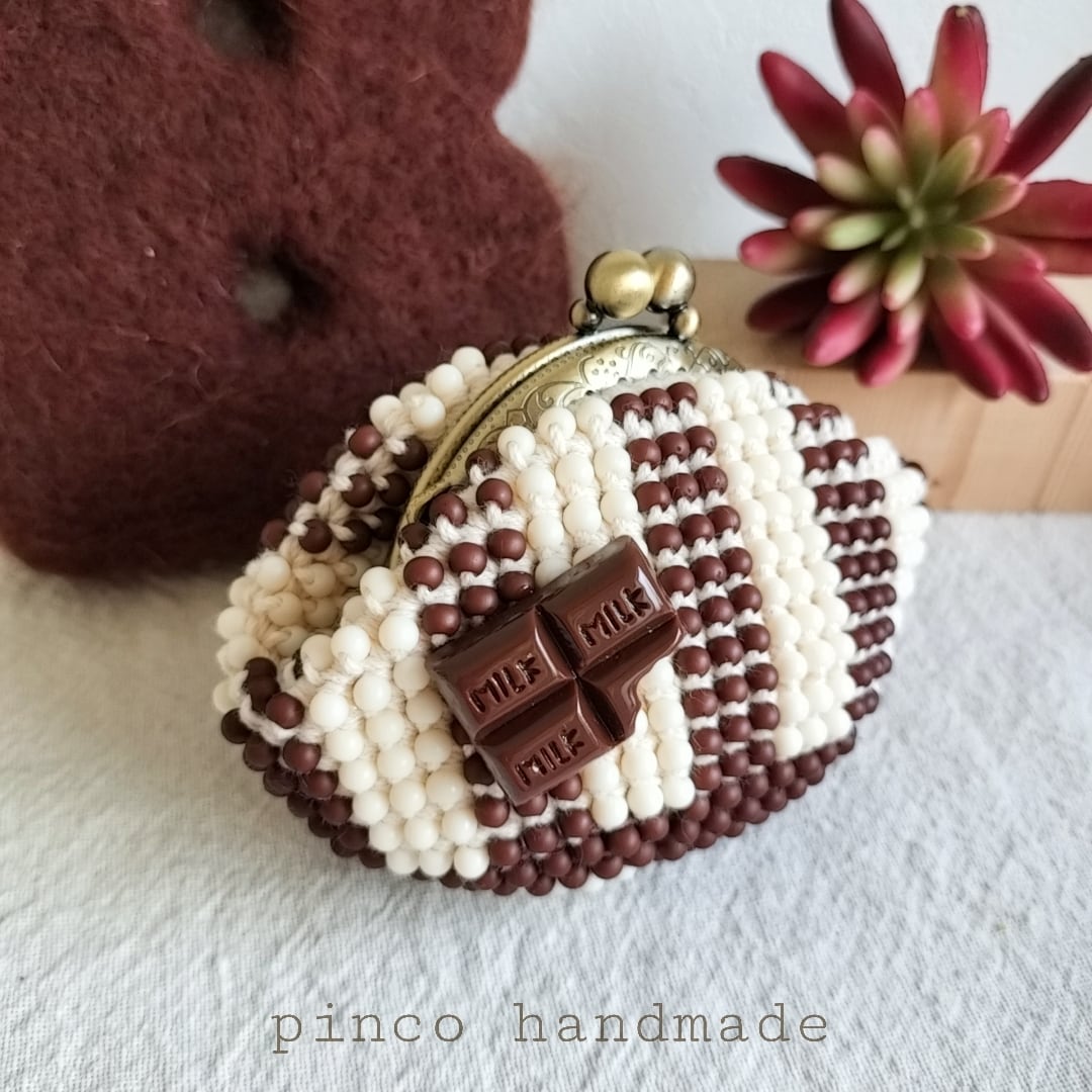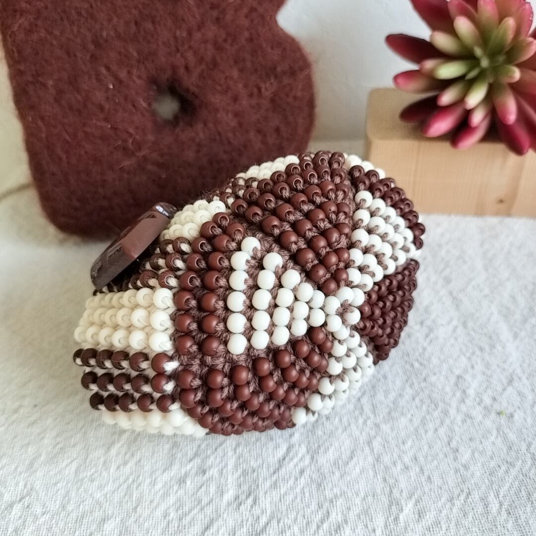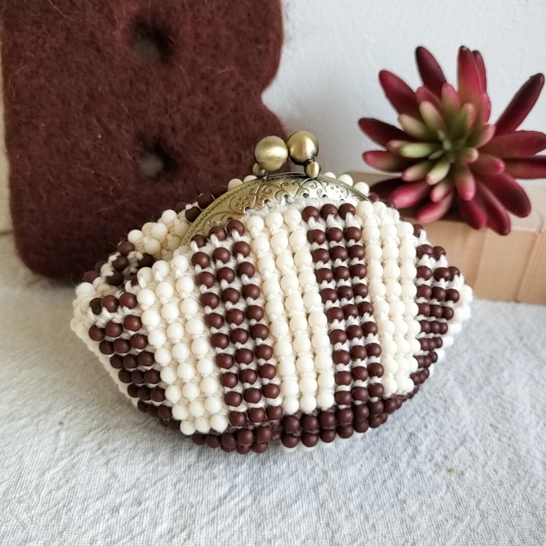 ぴんこの手染めビーズを編んだがま口.くまチョコB.ストライプ.こげ茶