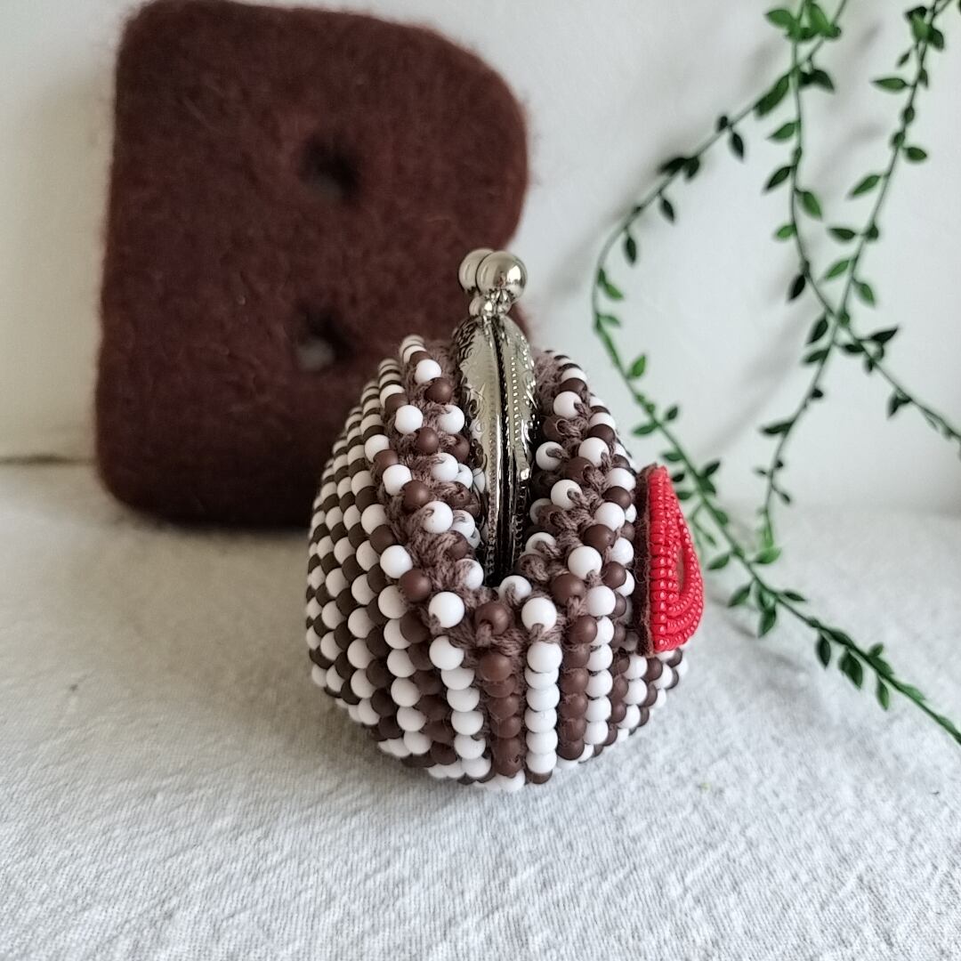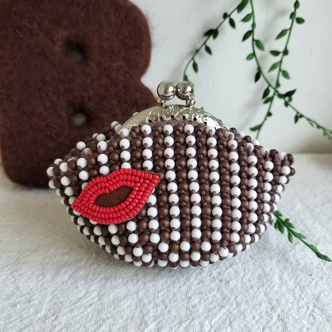 手刺繍ワッペン付き.手染めビーズを編んだがま口ストライプ.くちびる