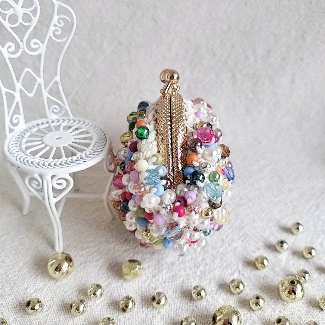 こちらの作品は染めてないビーズやパールビーズ(樹脂製)など織り交ぜたキラキラ仕立て。