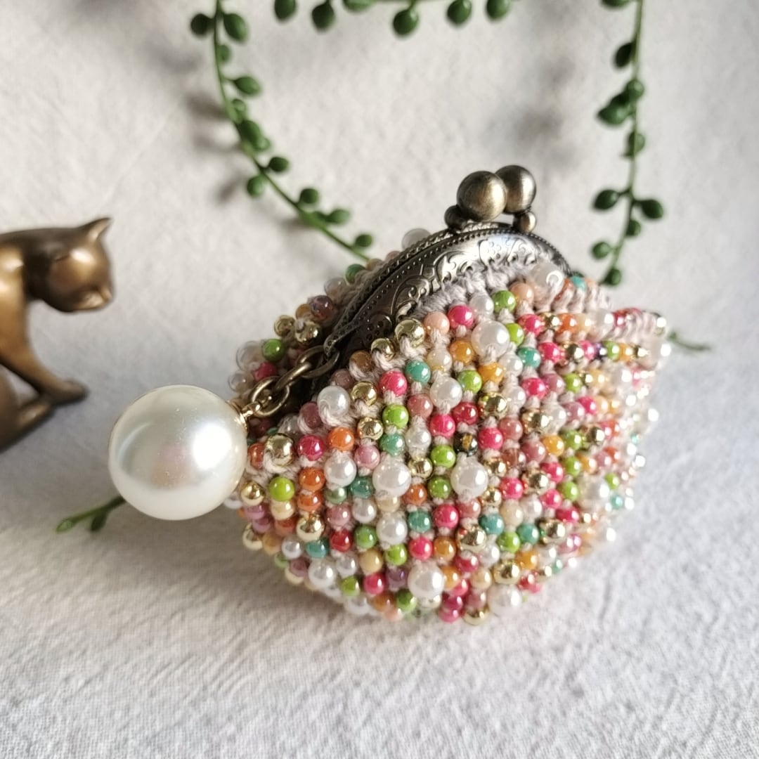 キラキラ手染めビーズを編んだがま口.口金6.5センチ