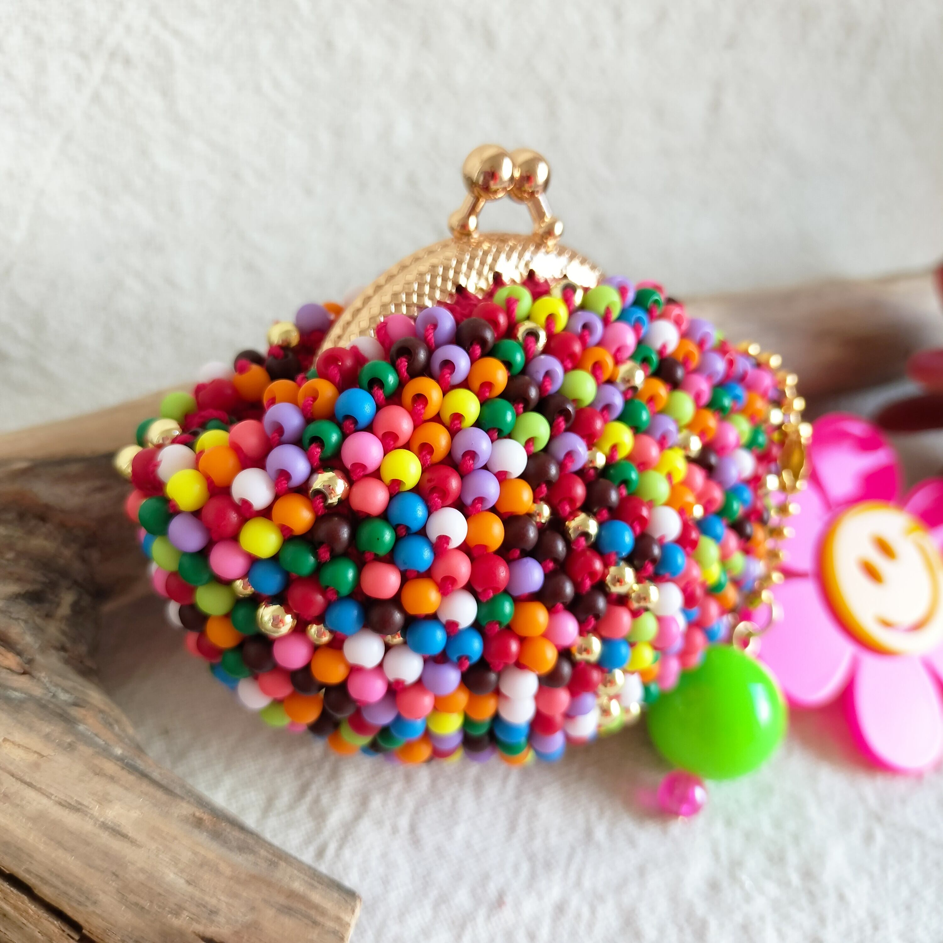 手染めのカラフルビーズを編み込んだ可愛いサイズのがま口です。