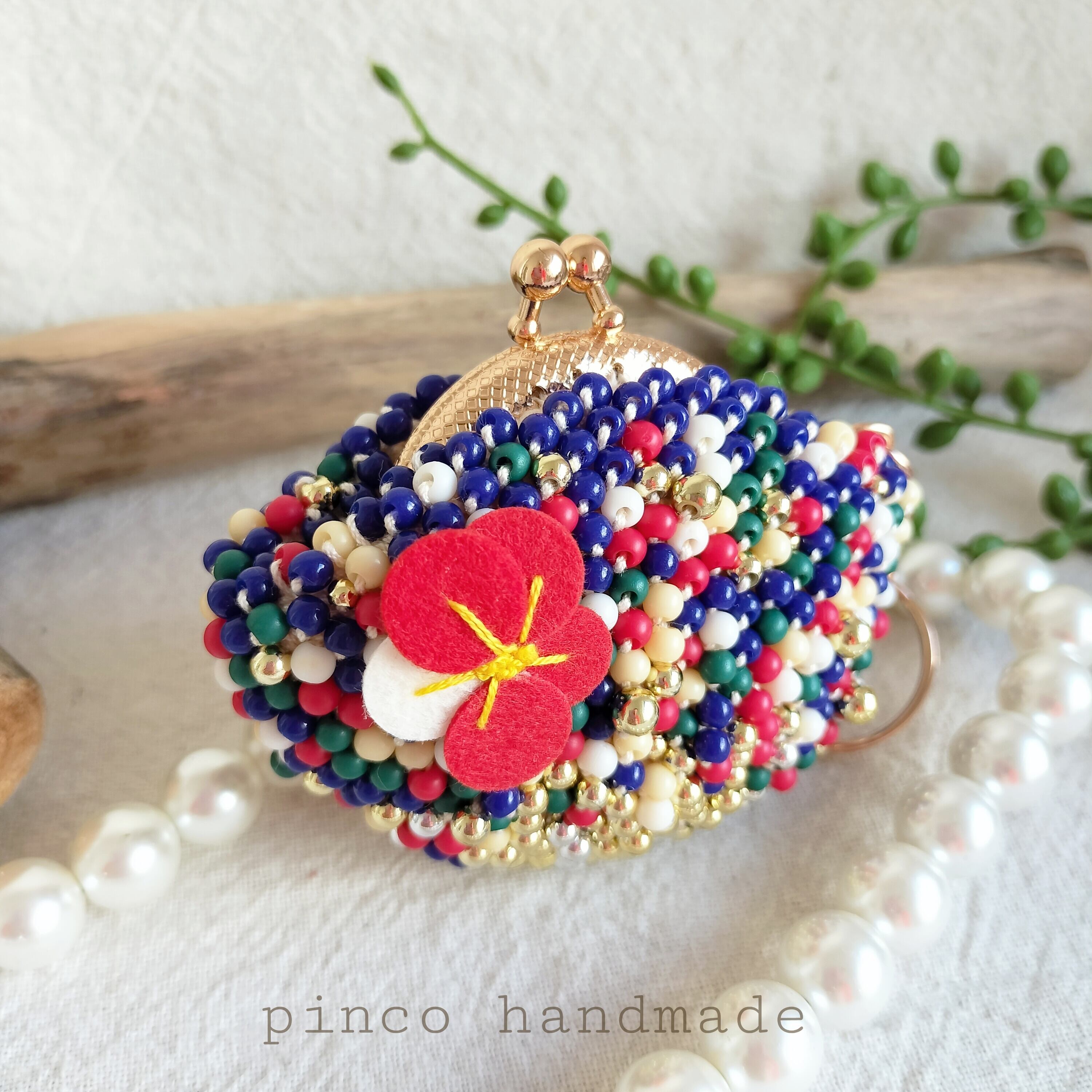 手染めビーズを編んだがま口.梅のピアス付き小さな口金5センチ