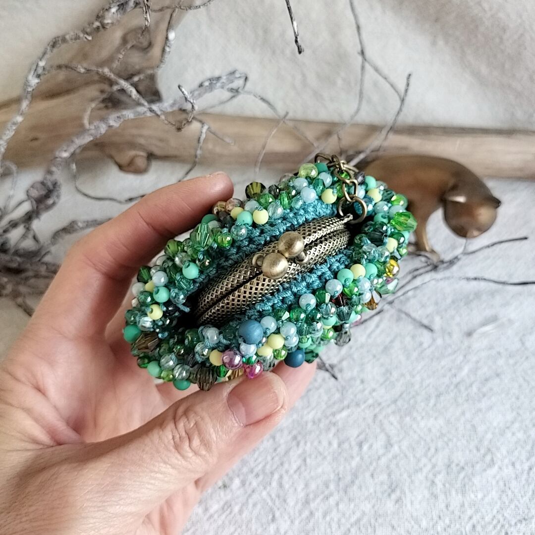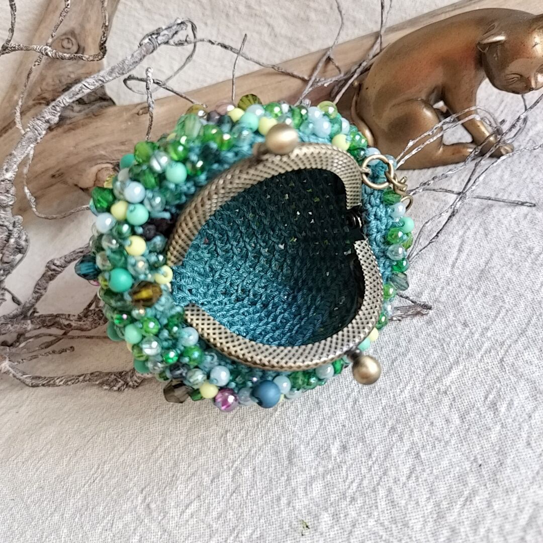 手染めのカラフルビーズを編み込んだ可愛いサイズのがま口です。
