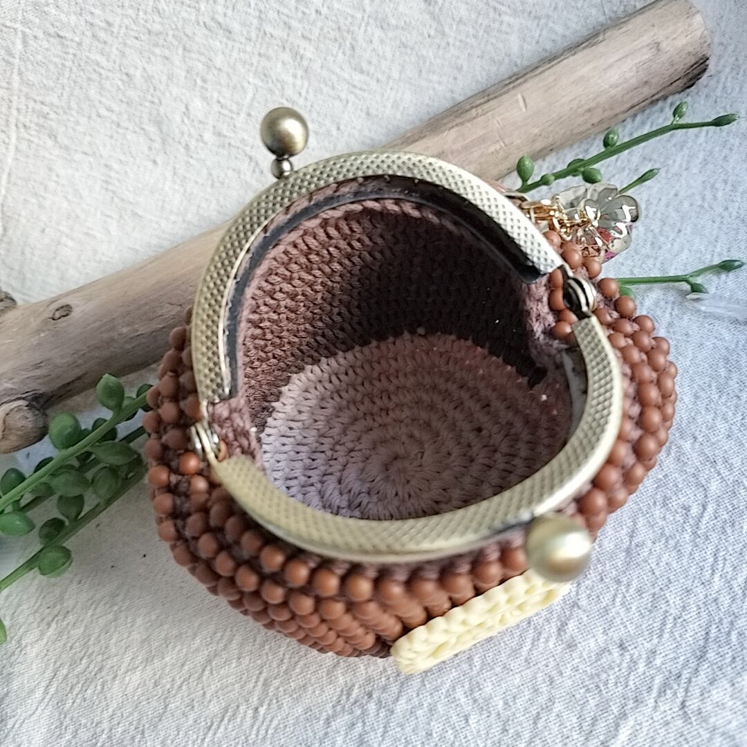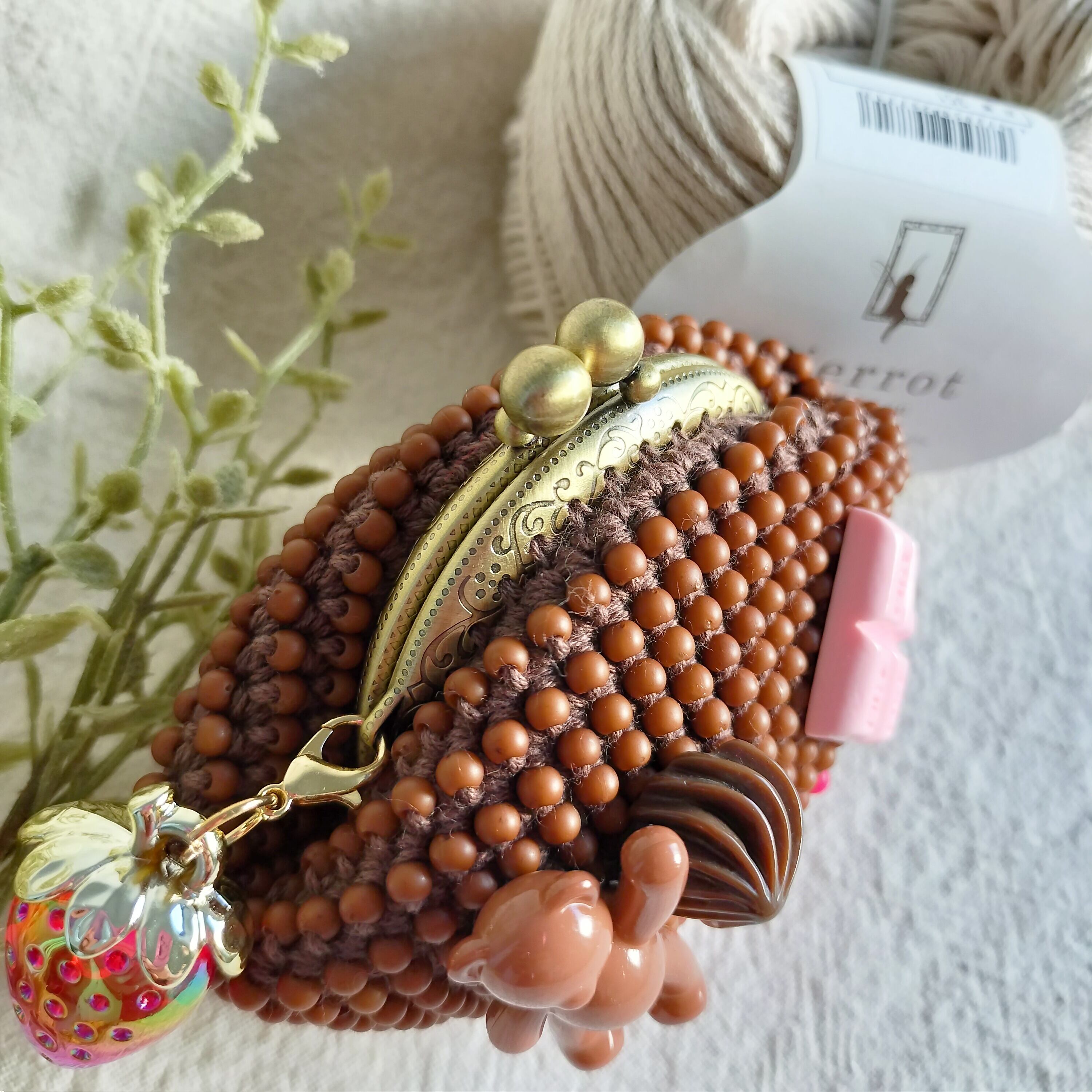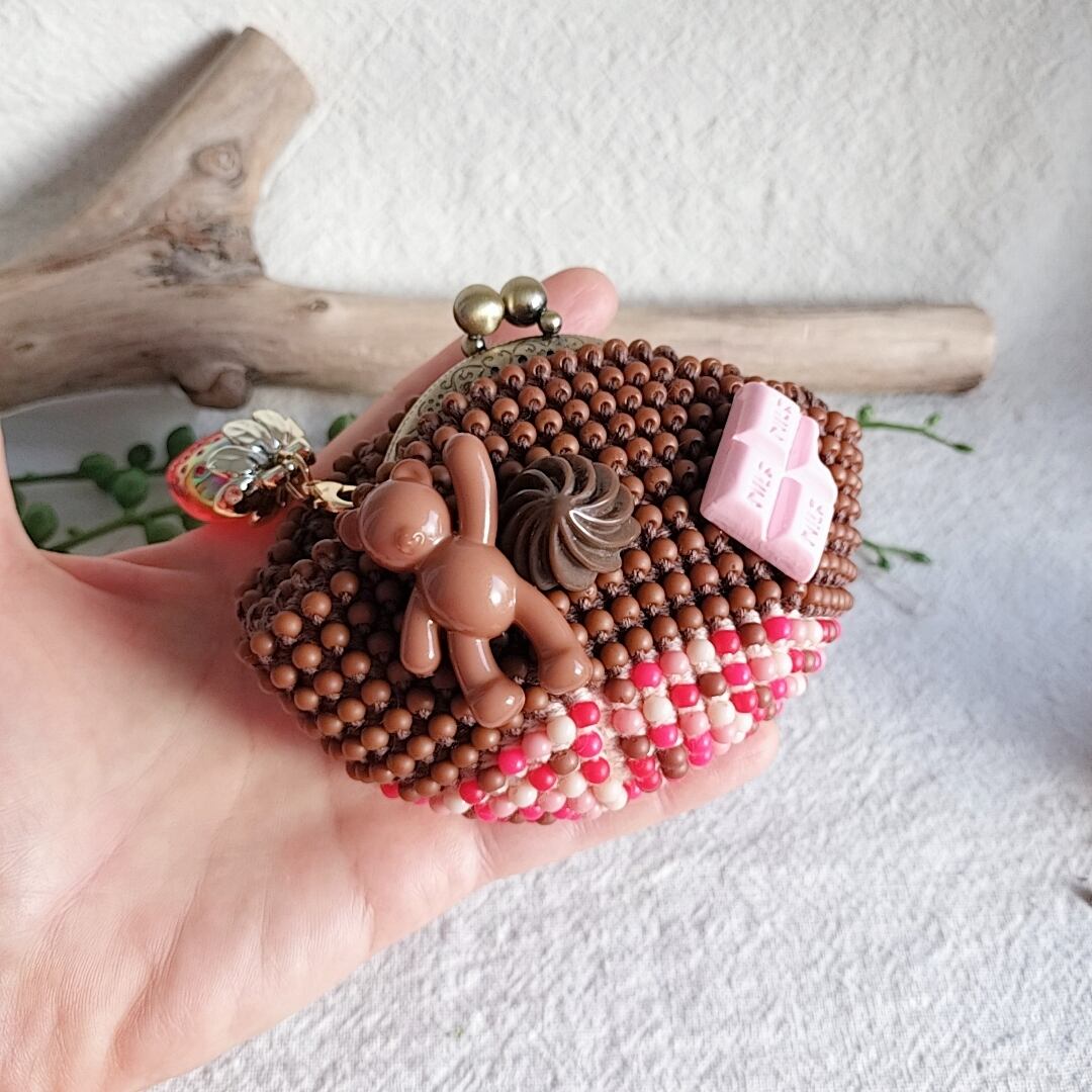 裏も可愛い!手染めビーズを編んだがま口.中サイズ口金6.5センチ、お菓子のくまさん