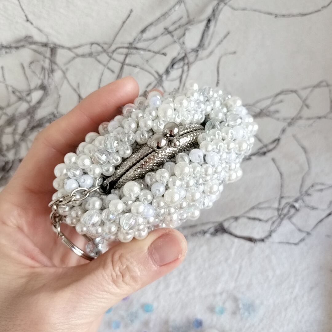 雪をイメージしたパールなどのビーズを編み込んだ可愛いサイズのがま口です。