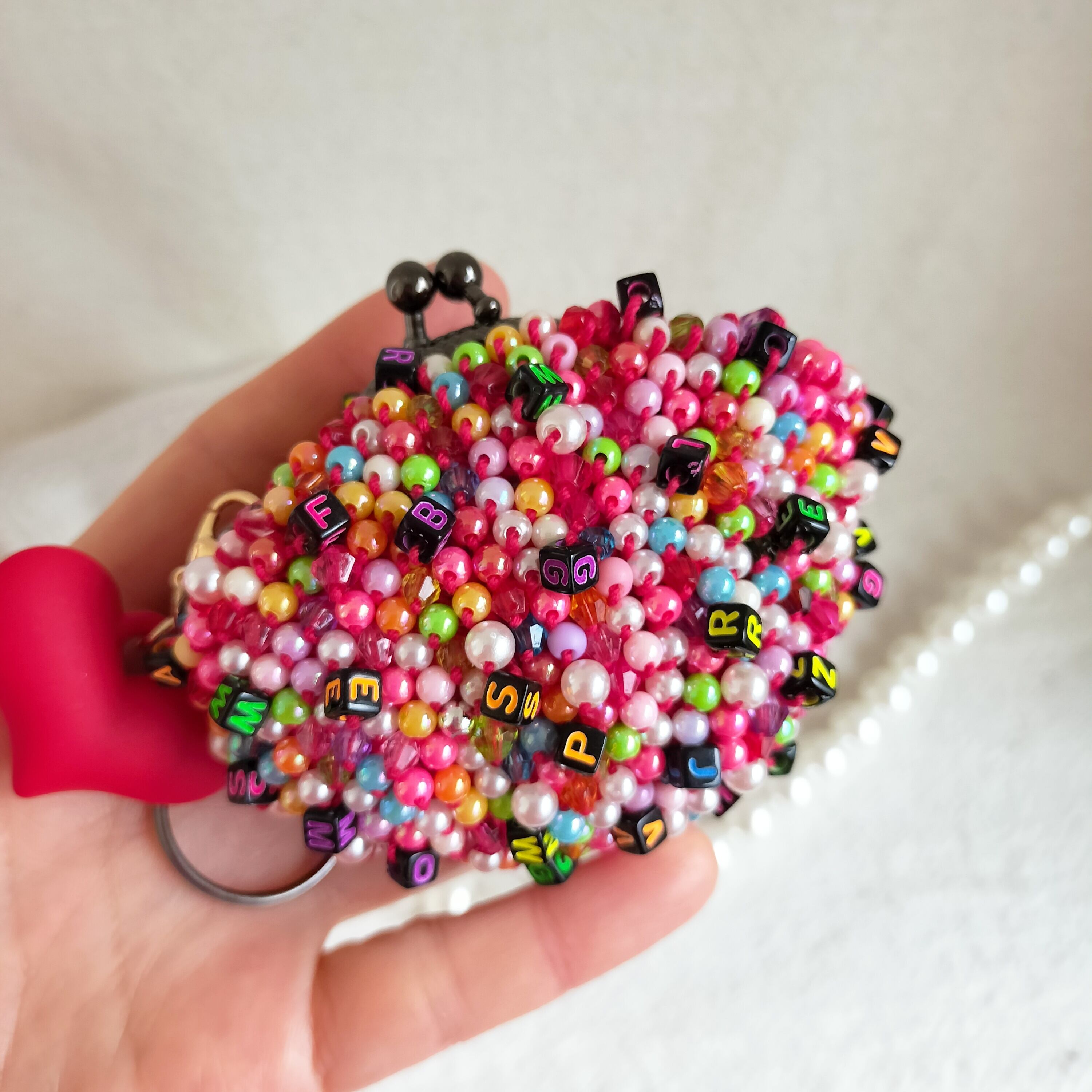 手染めビーズを編んだがま口.大きなハートチャーム、小さな口金5センチ