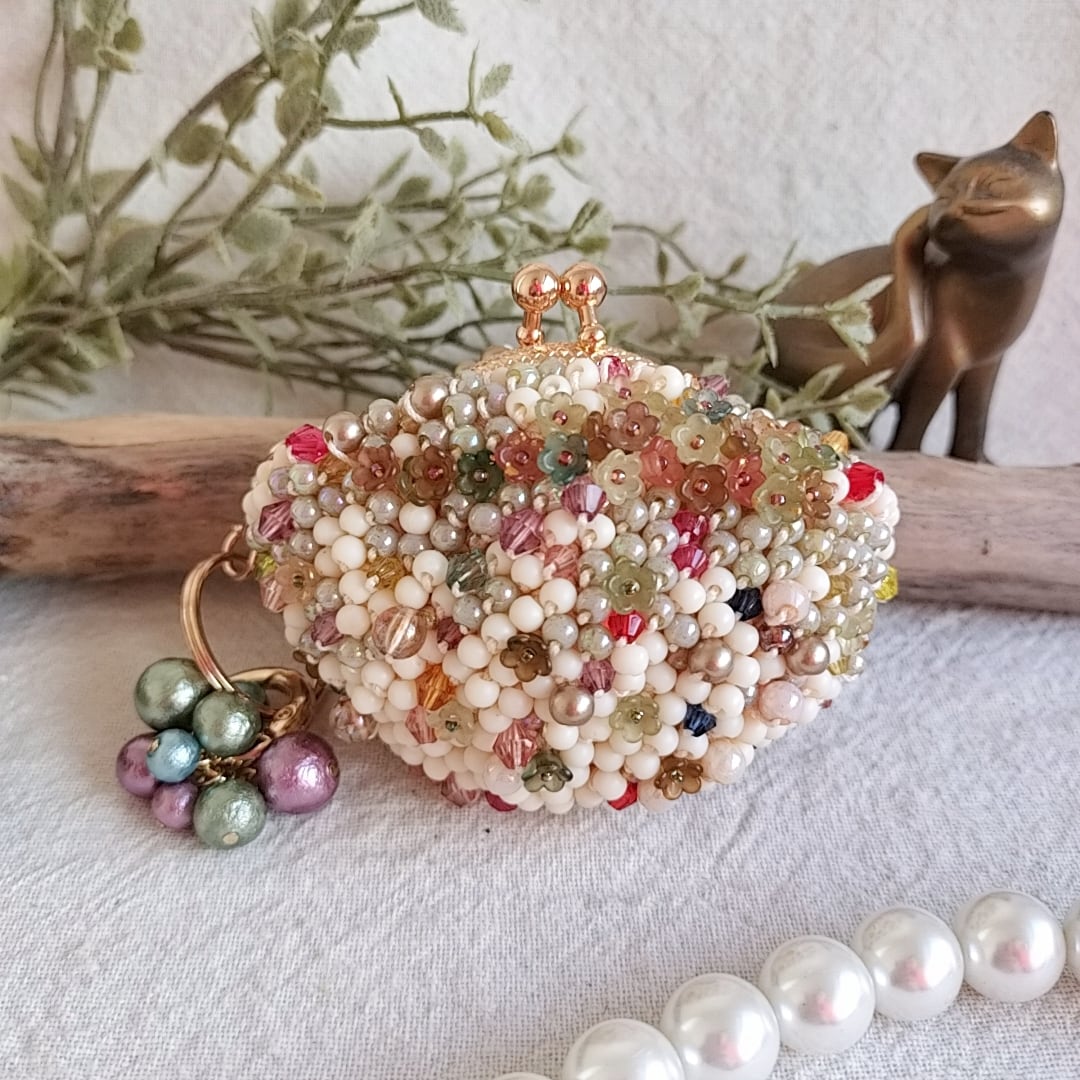 手染めビーズを編んだがま口.たくさんの小花刺しゅう、小さな口金5センチゴールド