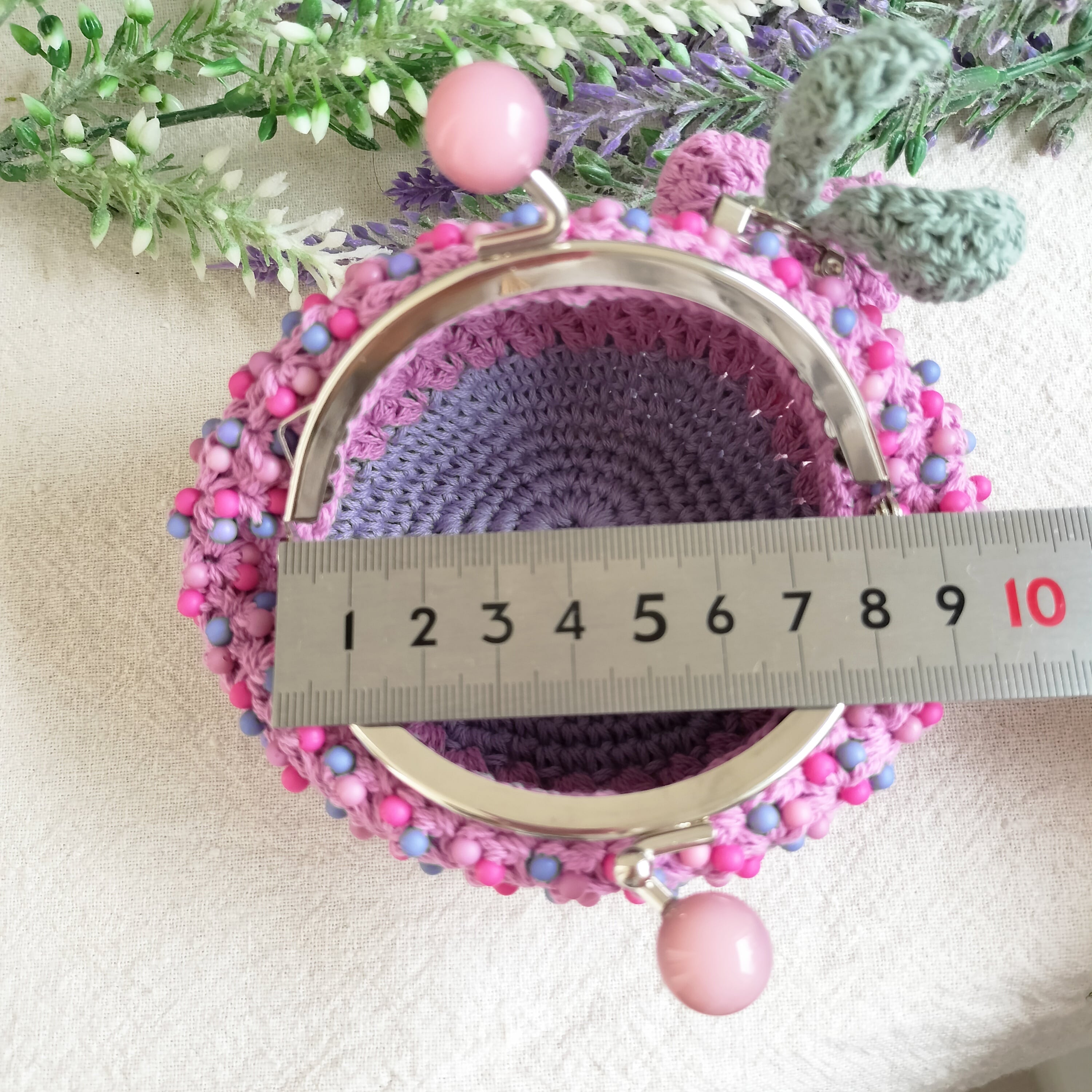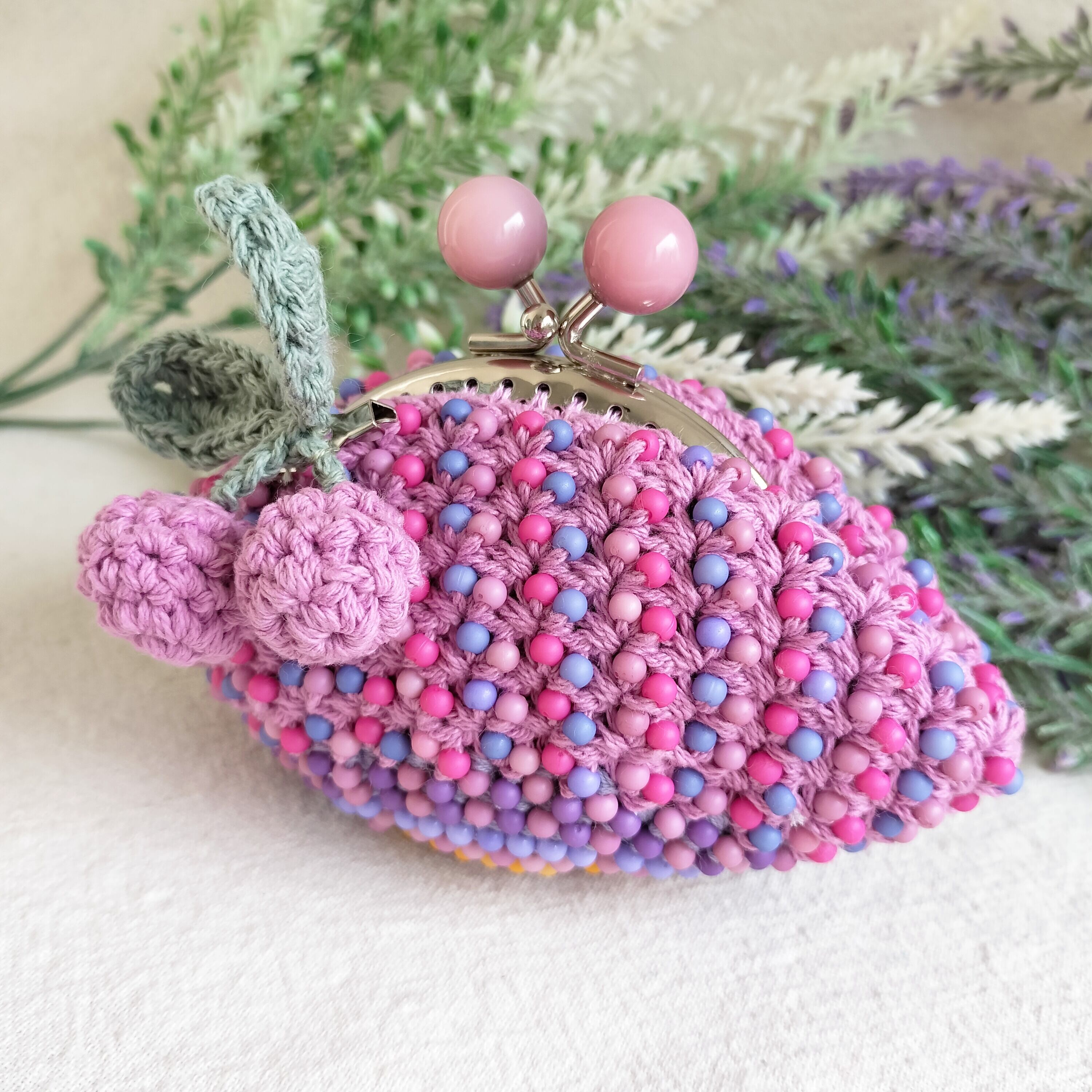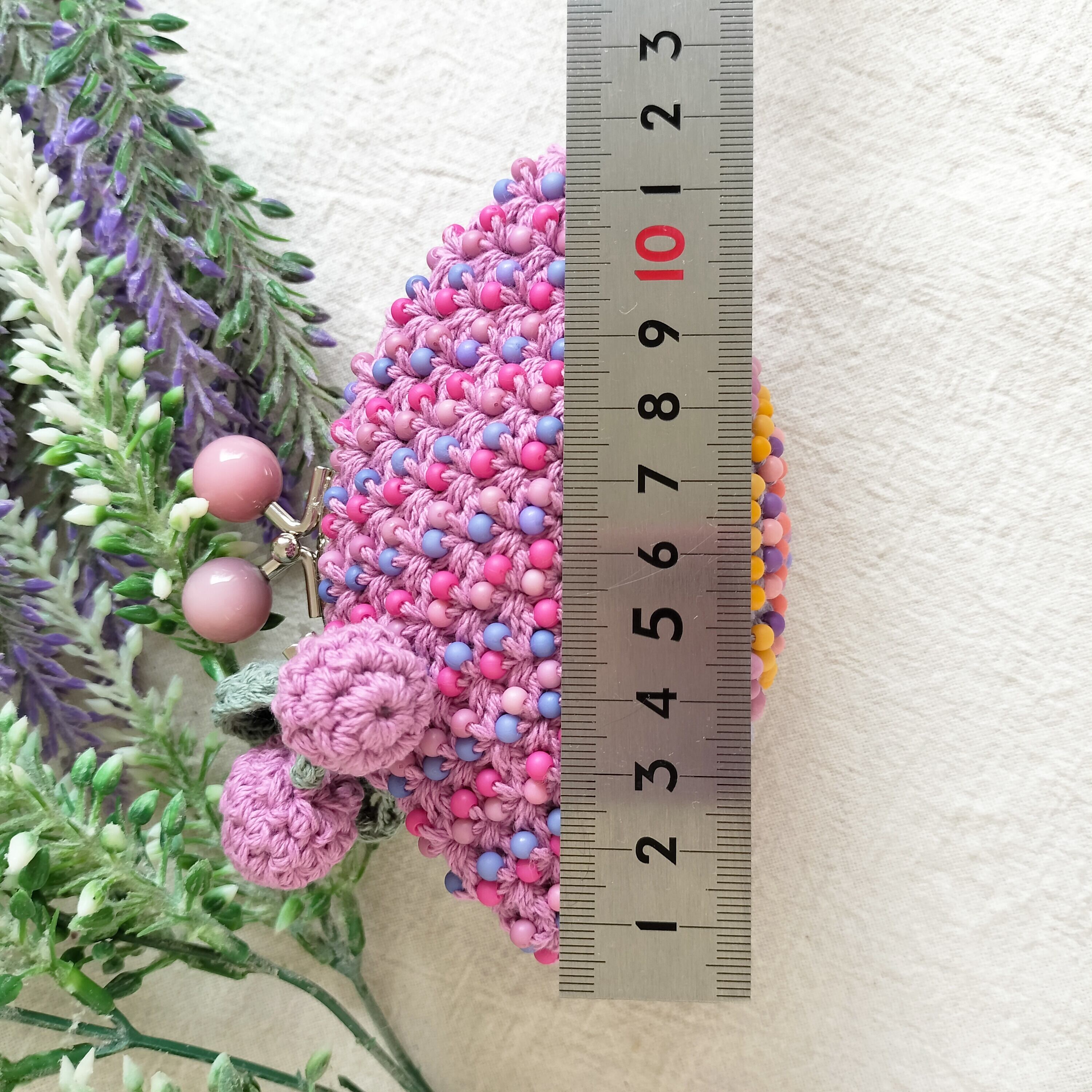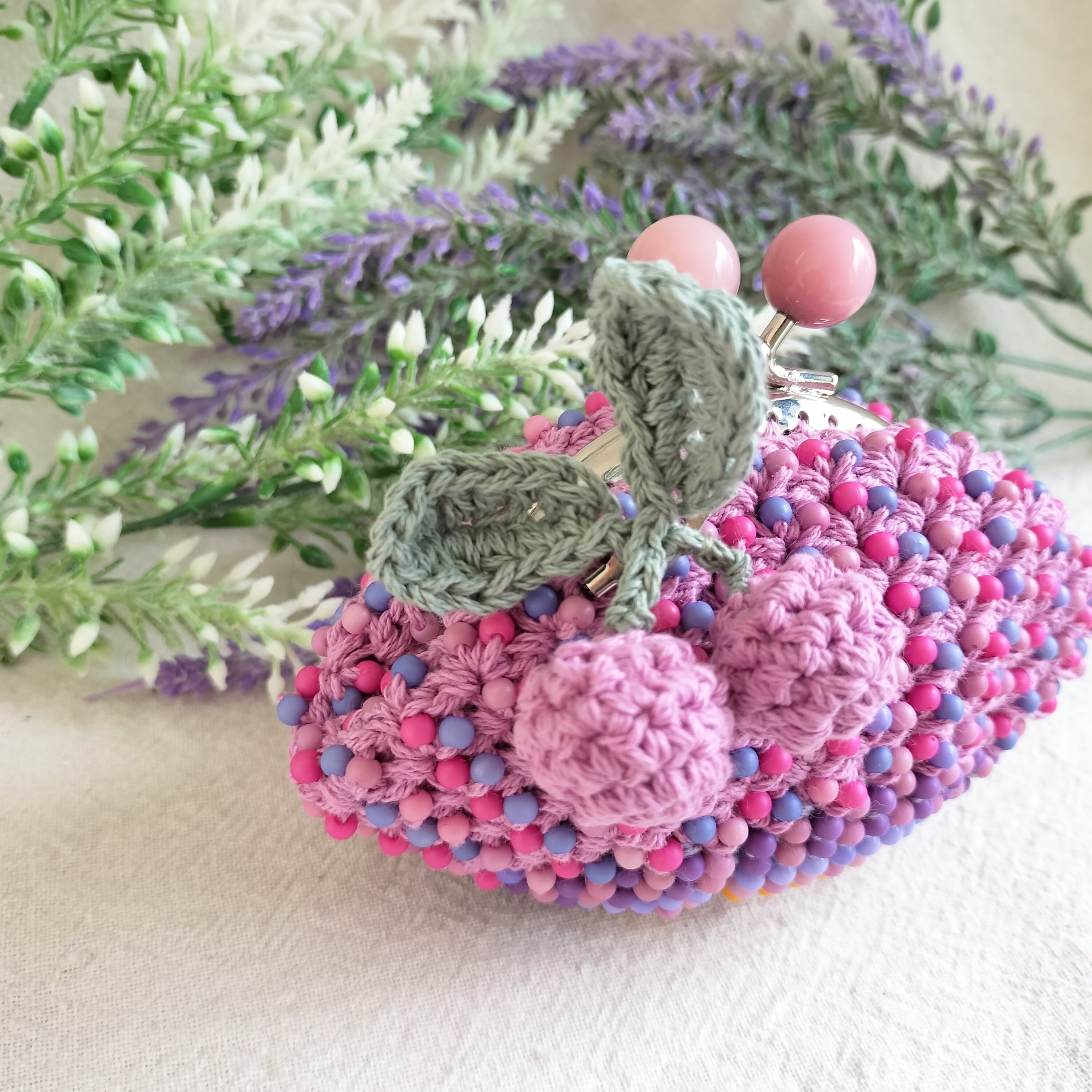 手染めビーズを編んだがま口.さくらんぼ、口金8.5センチ