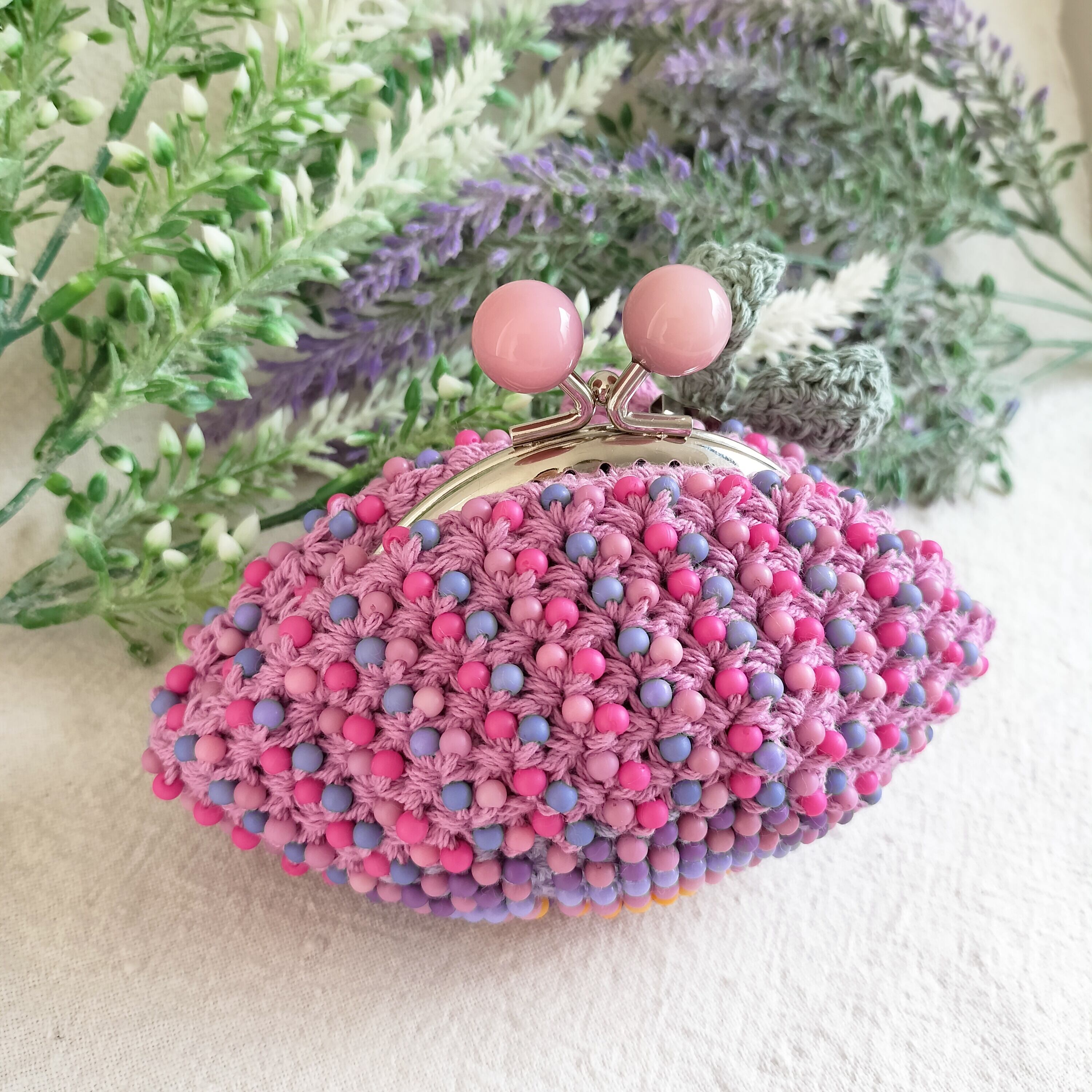 手染めのカラフルビーズを編み込んだ少し大きめ、8.5サイズ口金のがま口です。