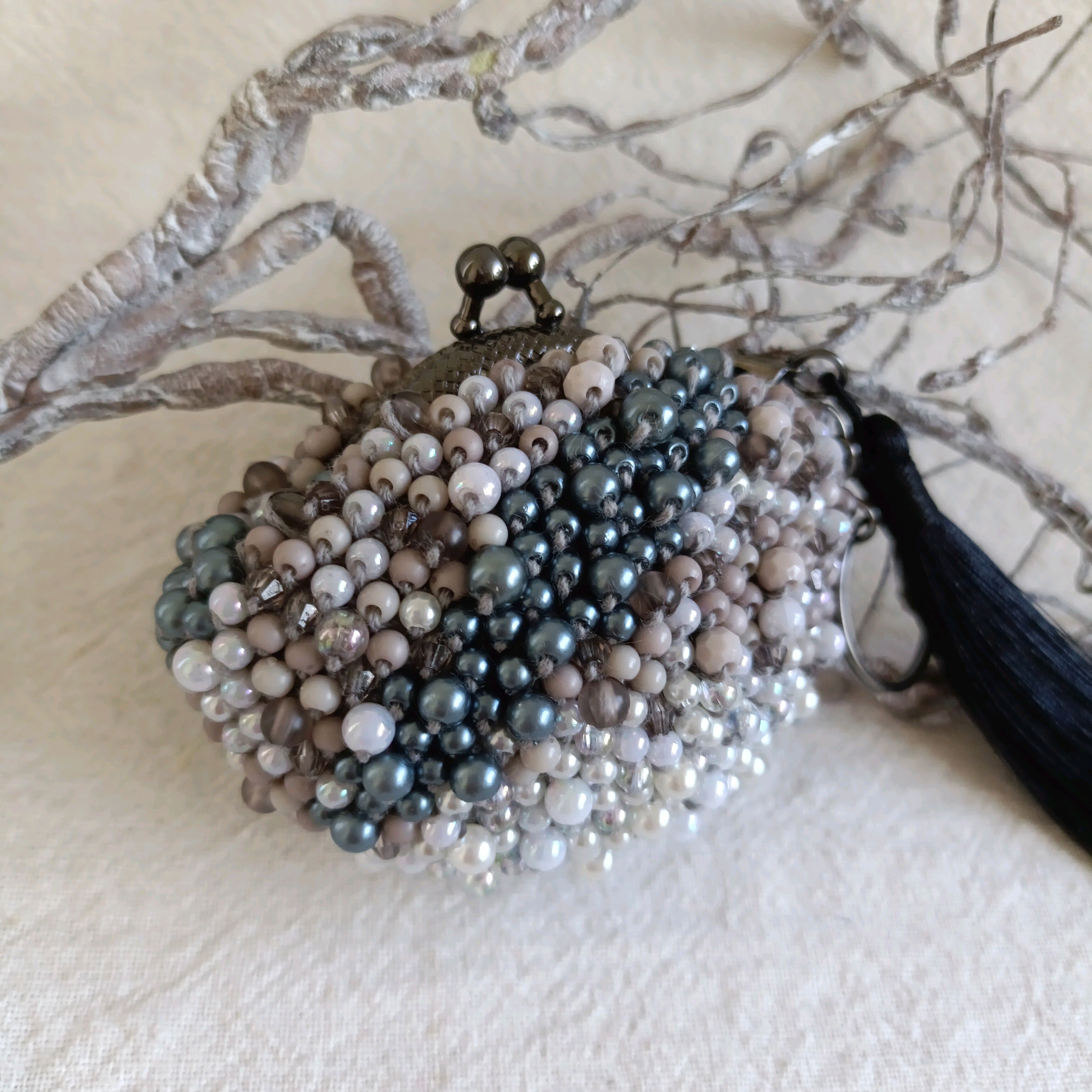 手染めビーズを編んだがま口.タッセル付き、筋波のモノトーン、小さな口金5センチ