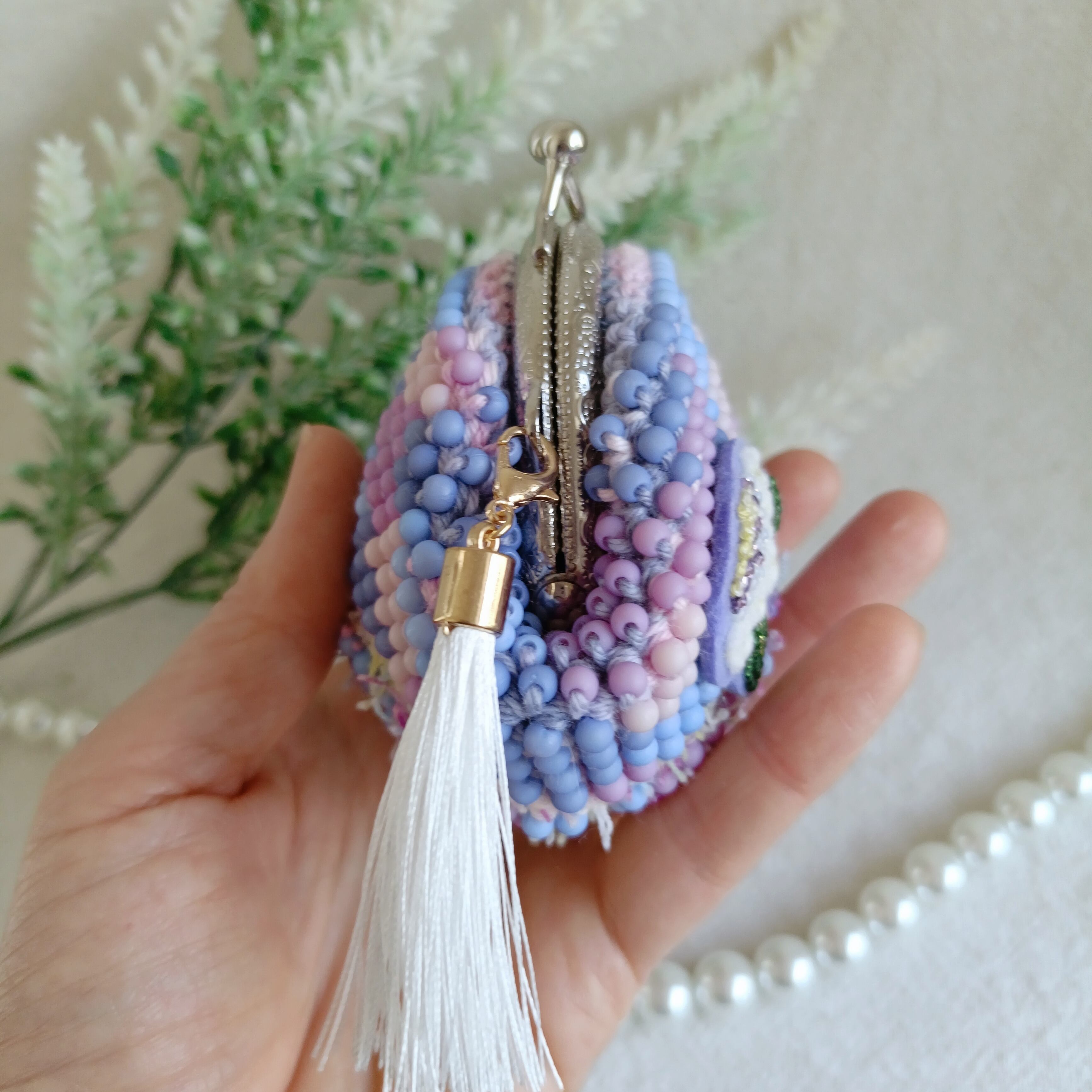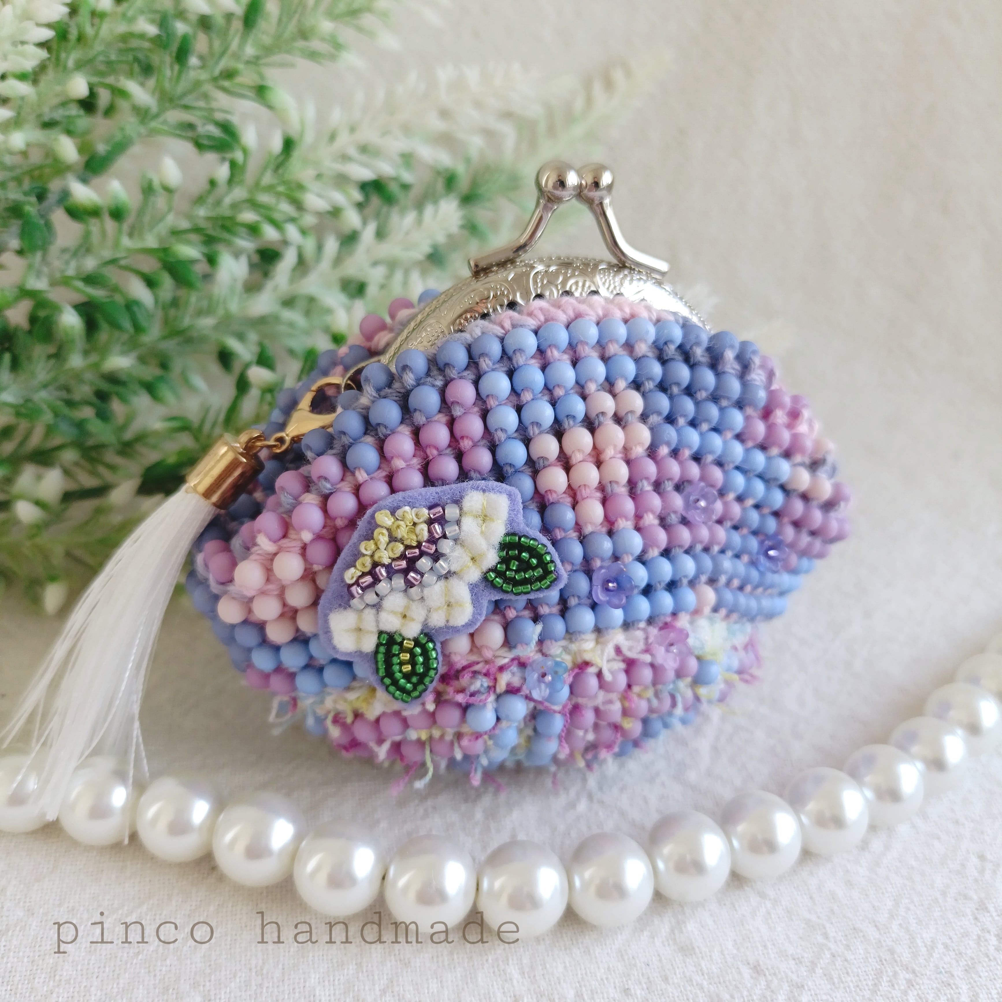 手染めビーズを編んだがま口.手刺繍ワッペン、紫陽花の園、口金6.5センチ