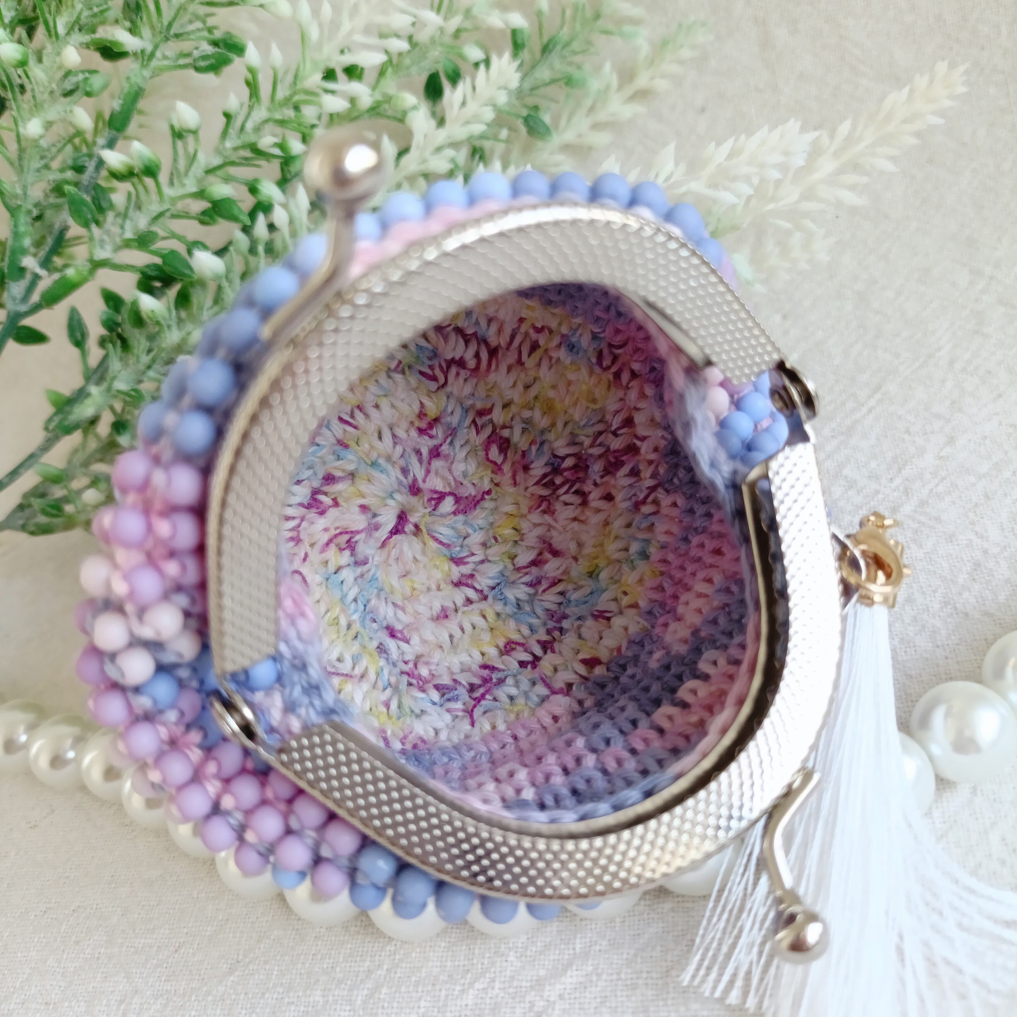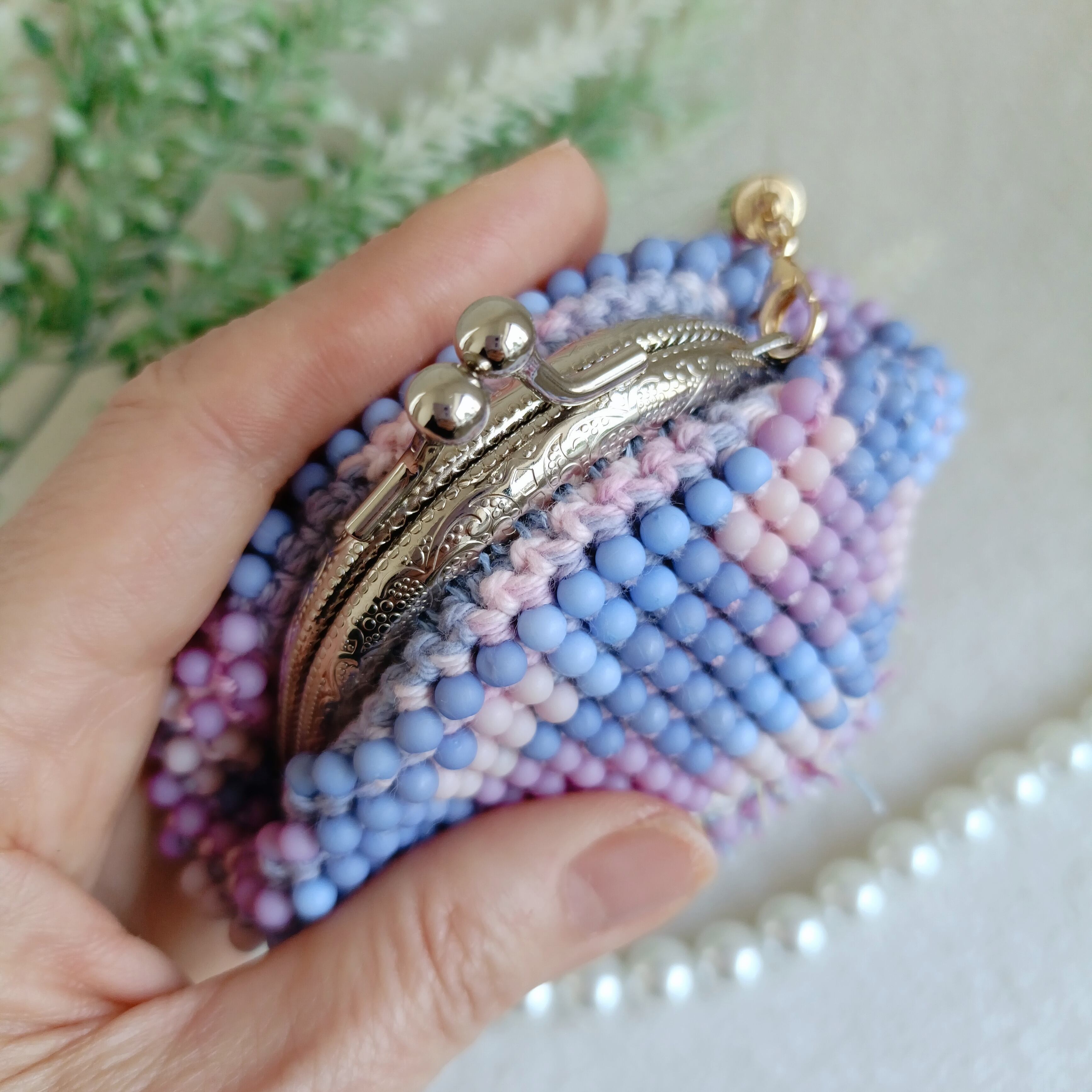 手染めのカラフルビーズを編み込んだ中サイズのがま口です。