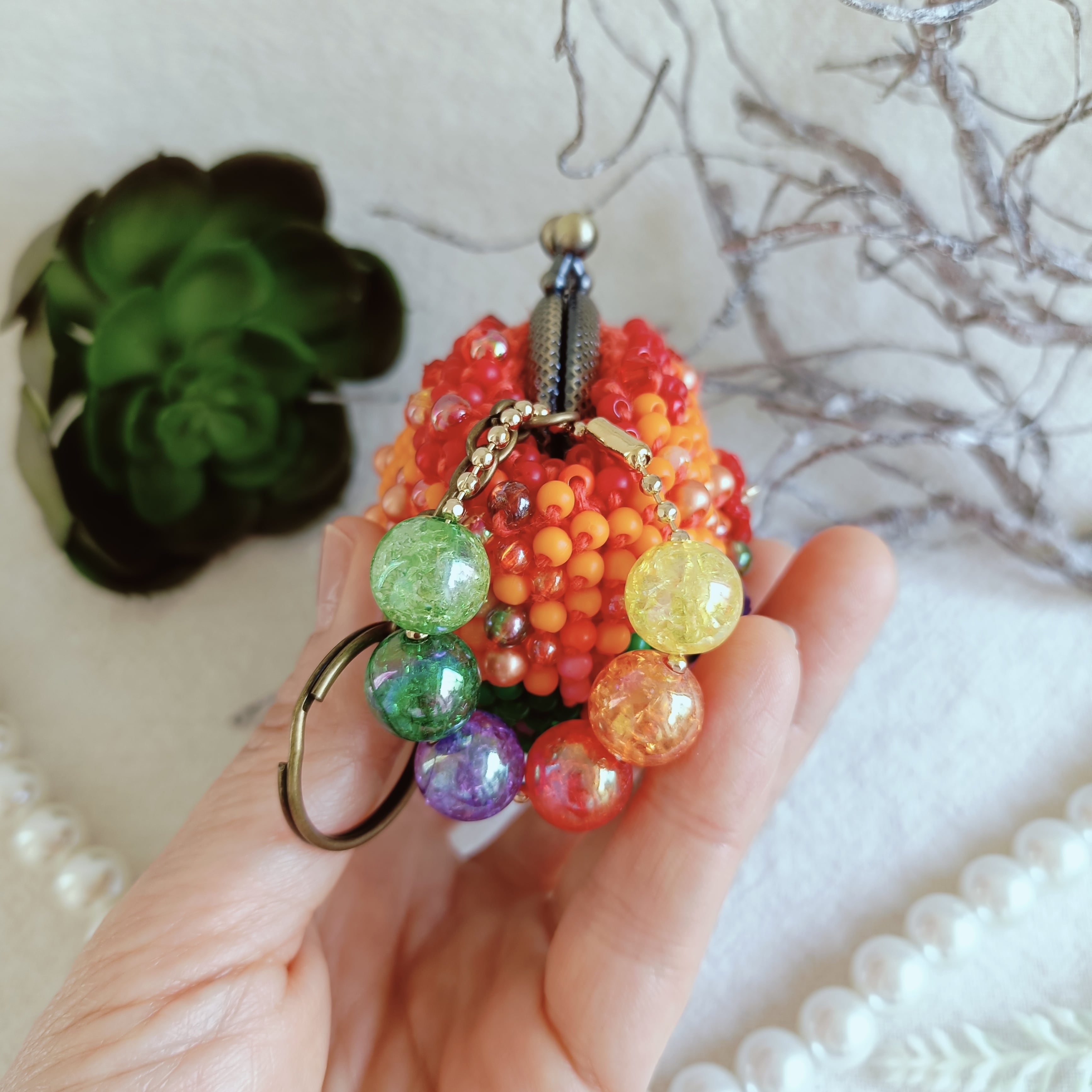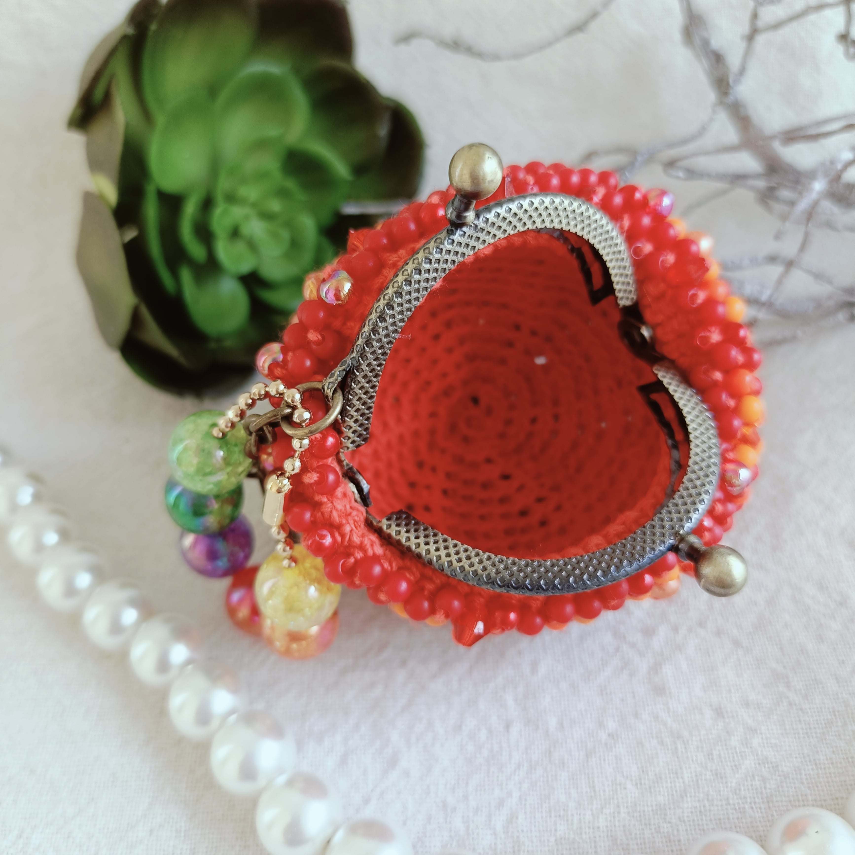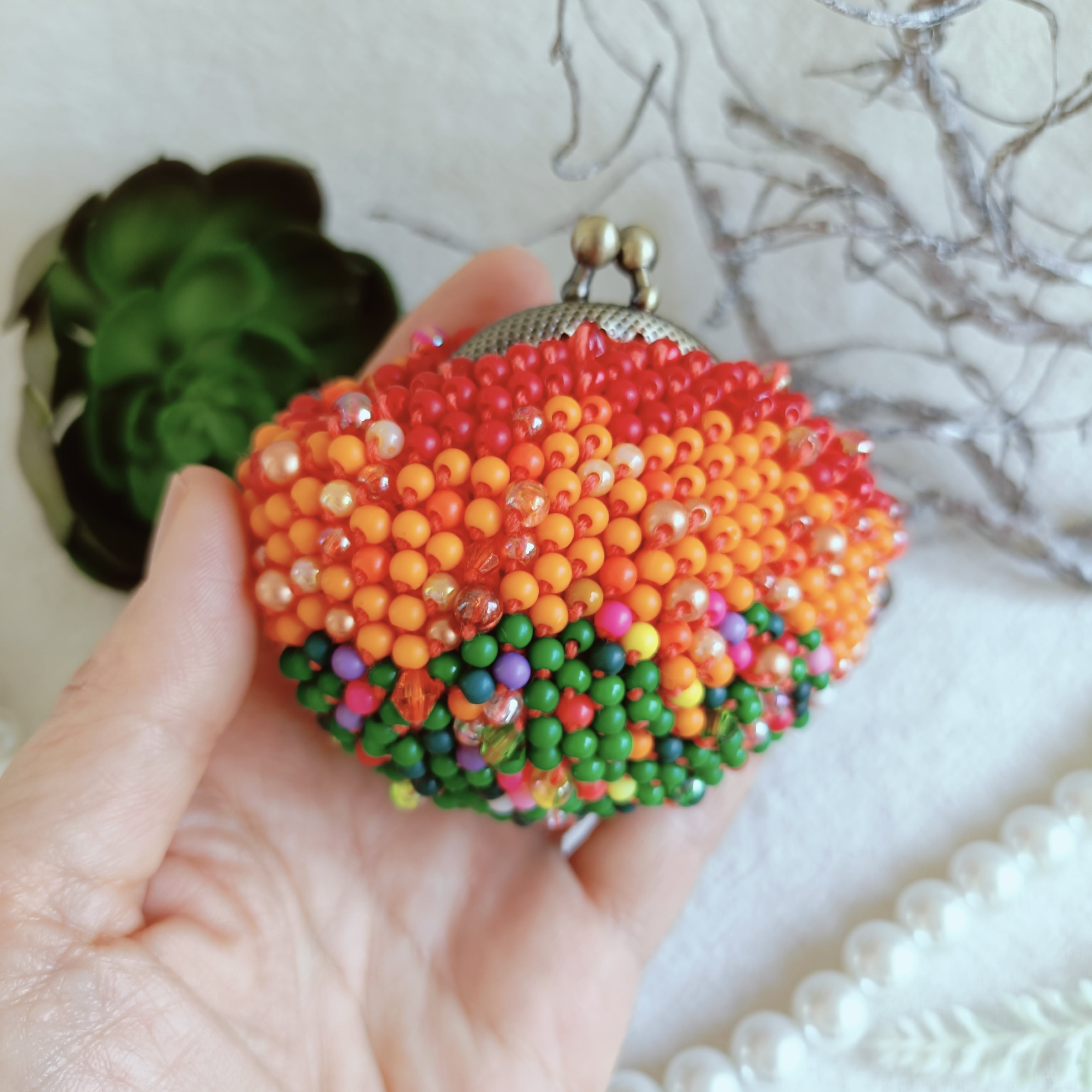 手染めビーズを編んだがま口.エキゾチックビタミンカラー、小さな口金5センチ