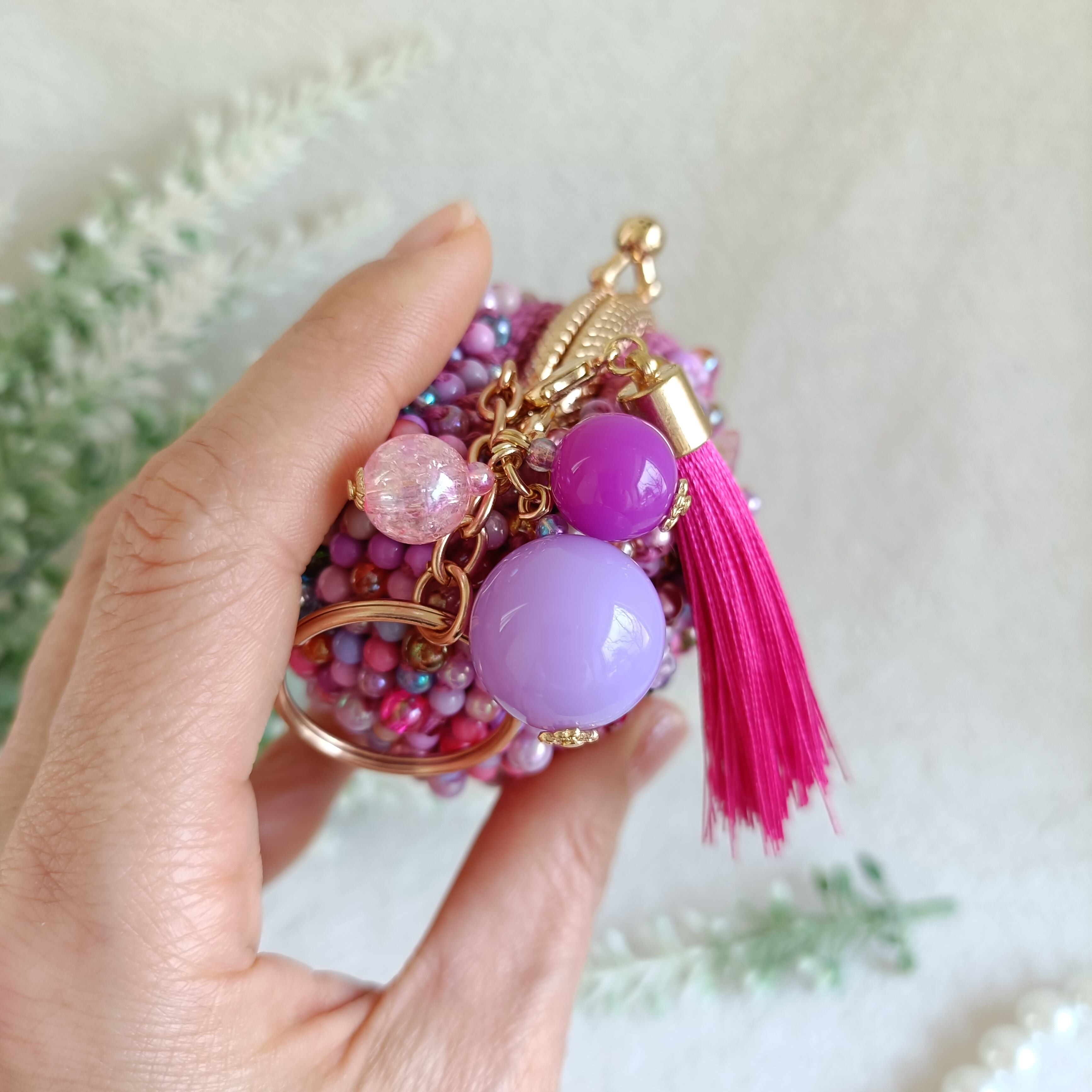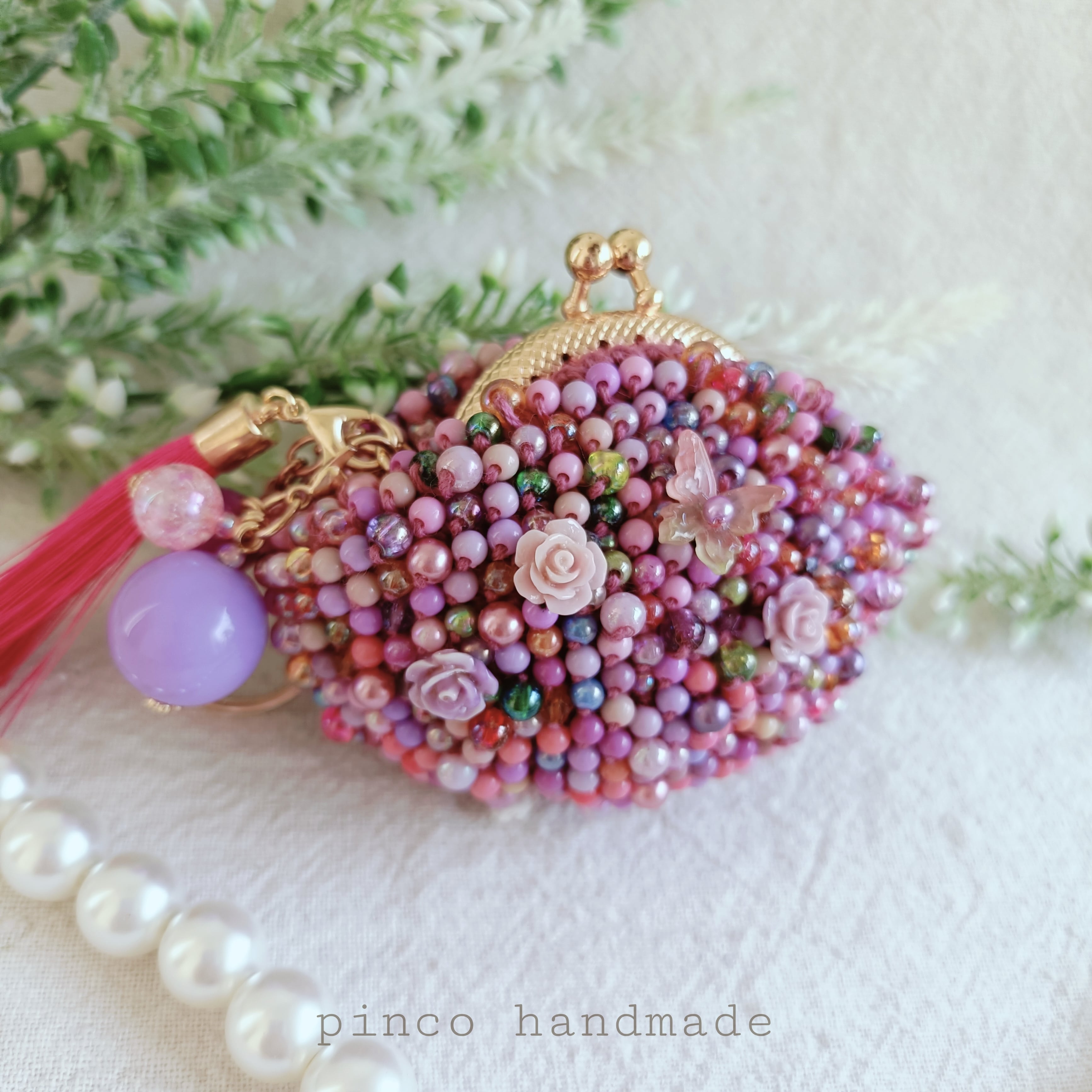 手染めビーズを編んだがま口.少し柔らかめ、レトロピンクな花園、小さな口金5センチ