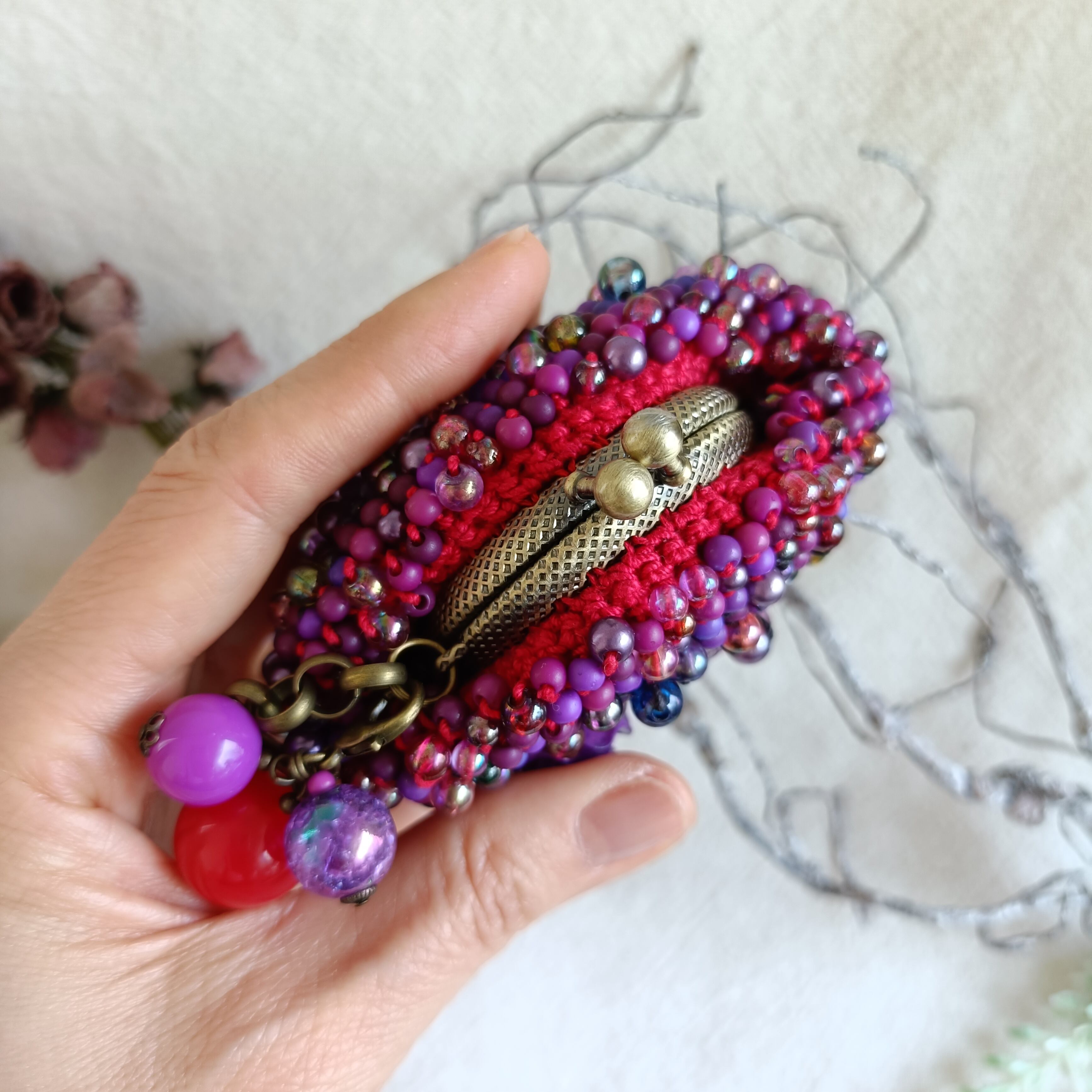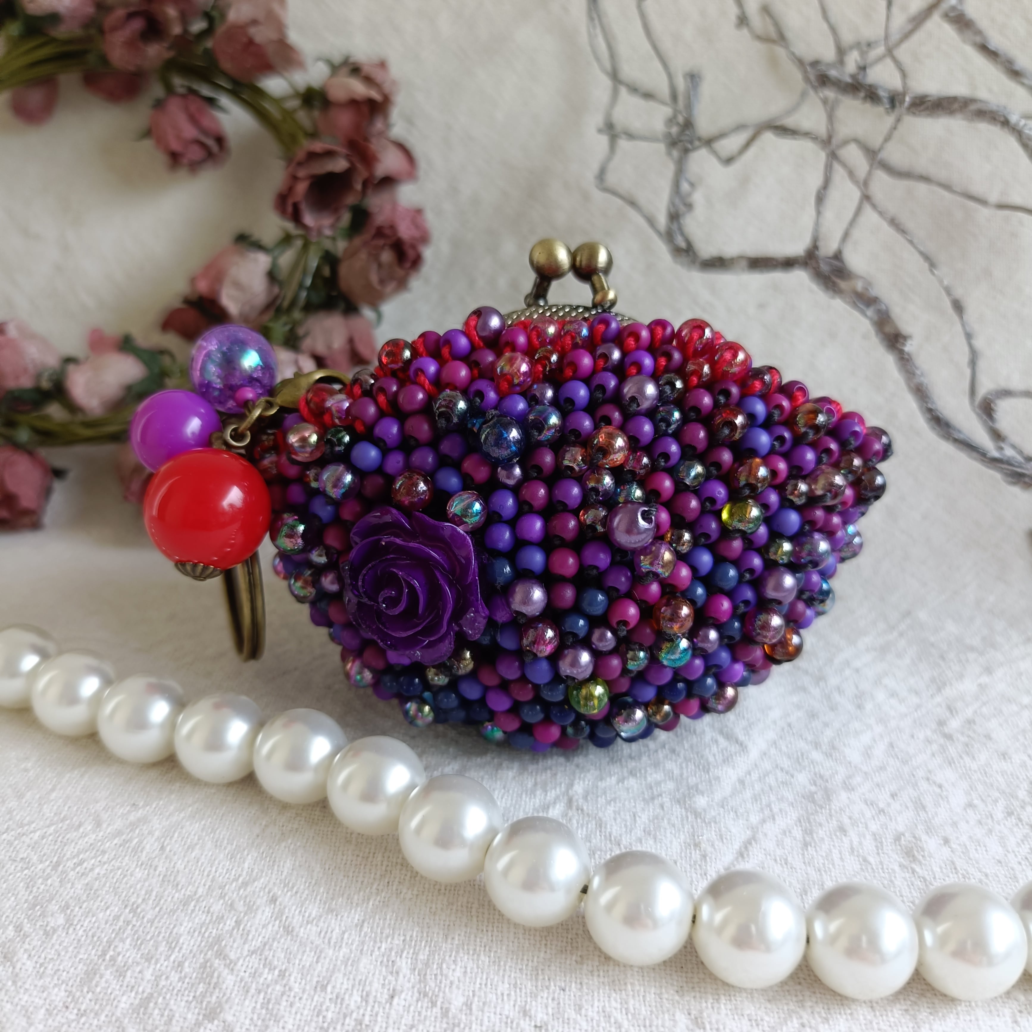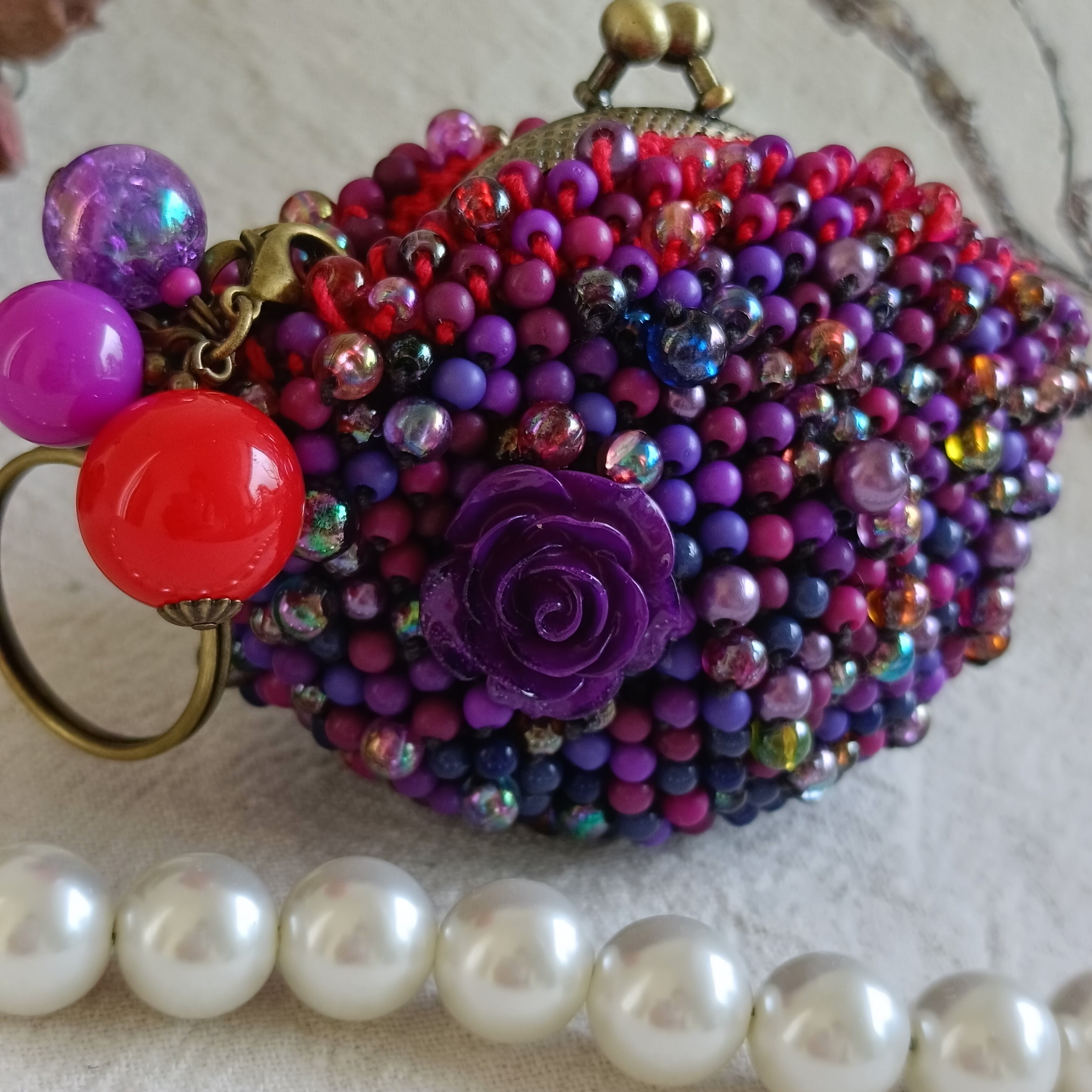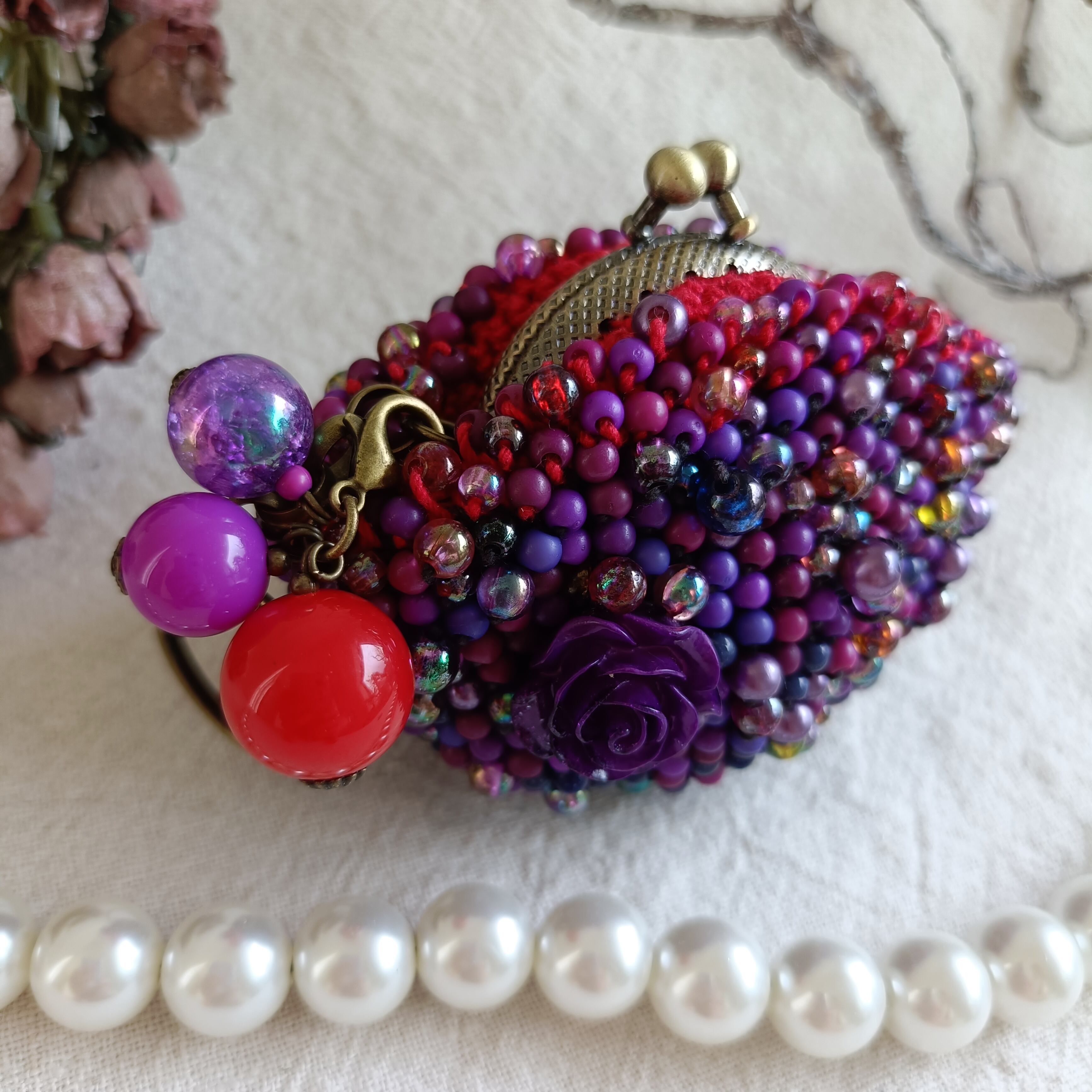 手染めビーズを編んだがま口.紫と赤の薔薇園、小さな口金5センチ