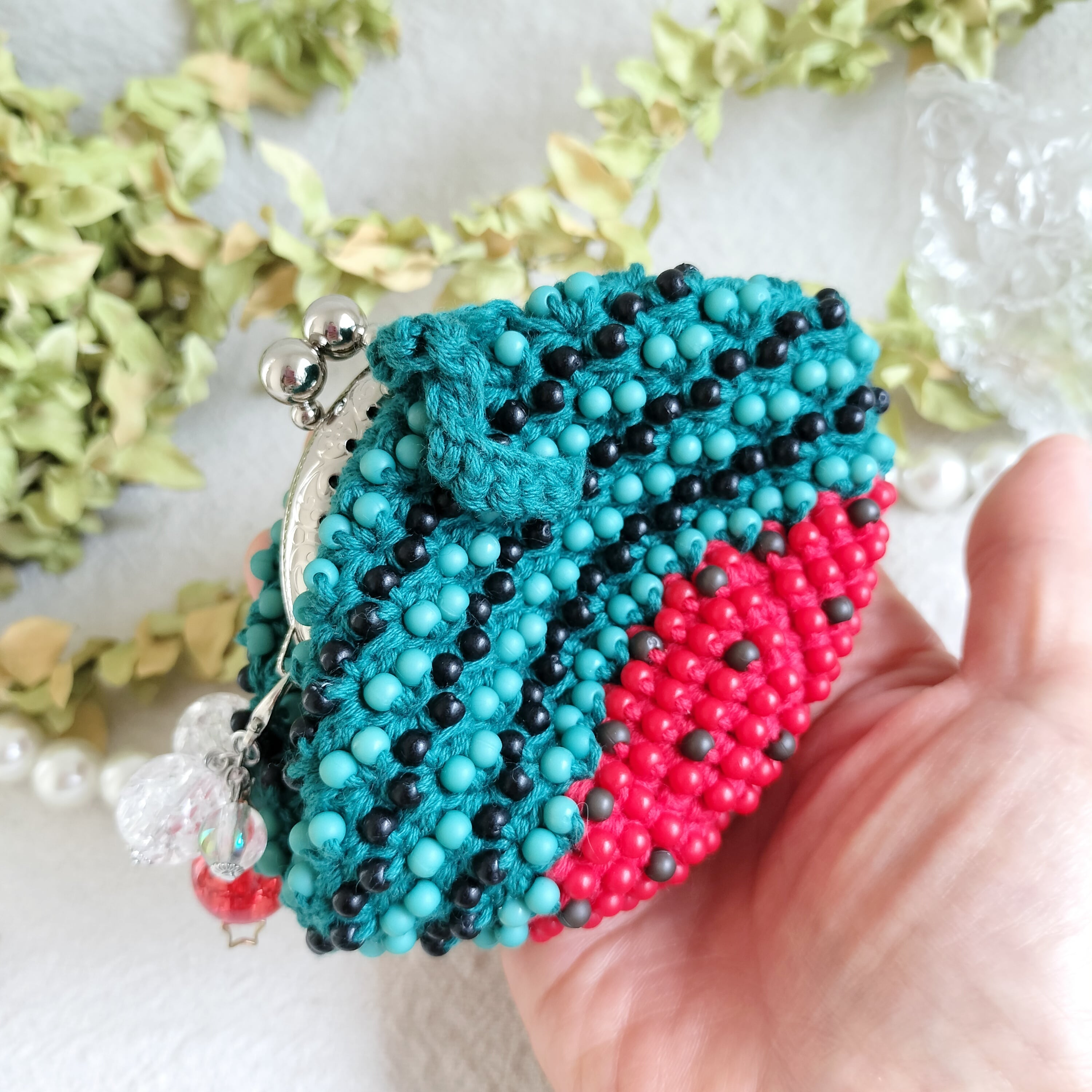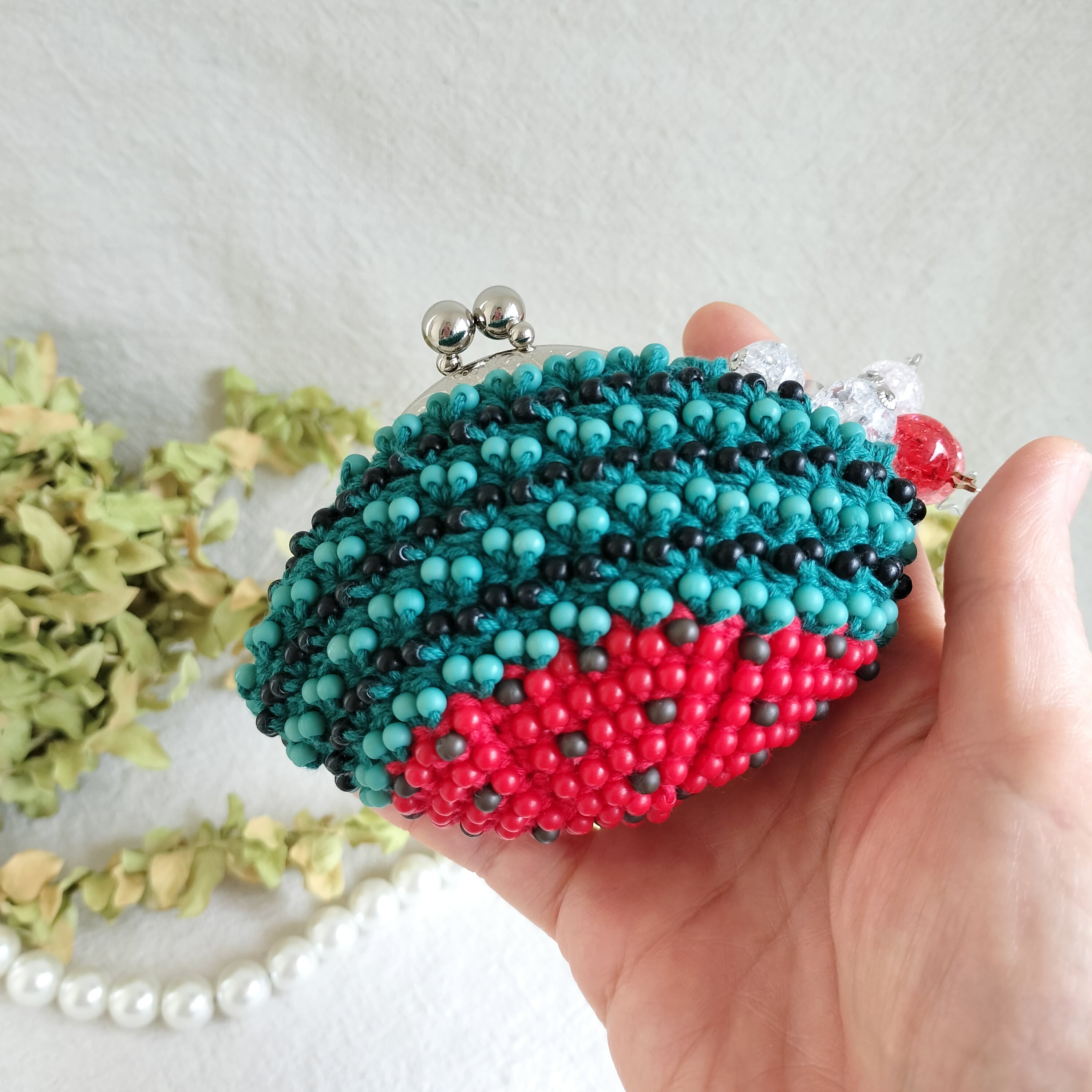 手染めビーズを編んだがま口.スイカさん中サイズ、口金6.5センチ